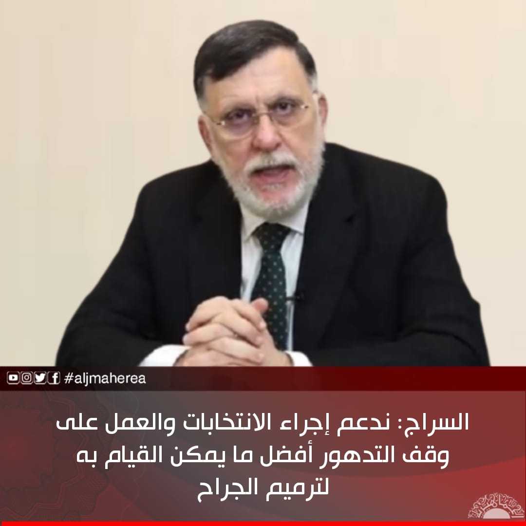 أكد رئيس المجلس الرئاسي غير الشرعي فائز السراج، مباركته ودعمه لـ«إجراء انتخابات رئاسية وبرلمانية في مثل هذا اليوم من العام القادم»، معتبرا أن «العمل لإيقاف التدهور أفضل ما تقوم به القوى السياسية لترميم الجراح».
