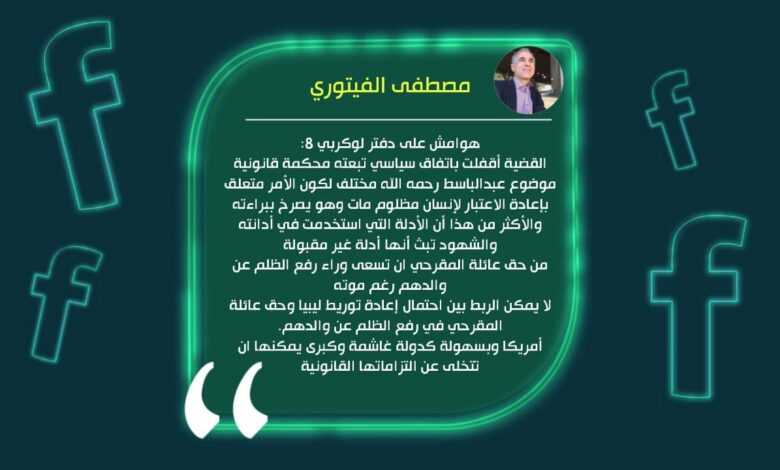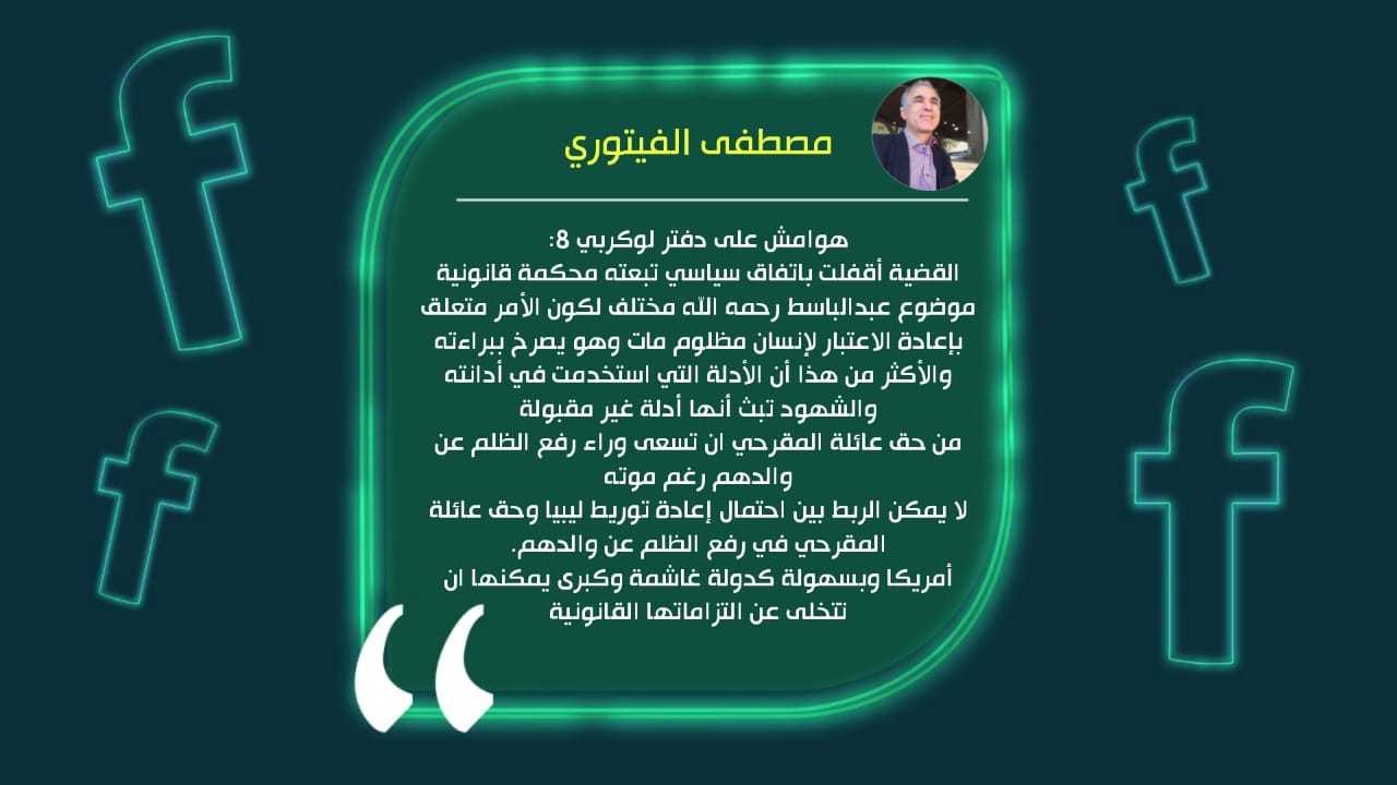 وأوضح الفيتوري في تدوينة نشرها على صفحته بعنوان هوامش على دفتر لوكربي 8 أن موضوع عبدالباسط رحمه الله مختلف لكون الأمر متعلق بإعادة الاعتبار لإنسان مظلوم مات وهو يصرخ ببراءته والأكثر من هذا أن الأدلة التي استخدمت في أدانته والشهود تبث أنها أدلة غير مقبولة