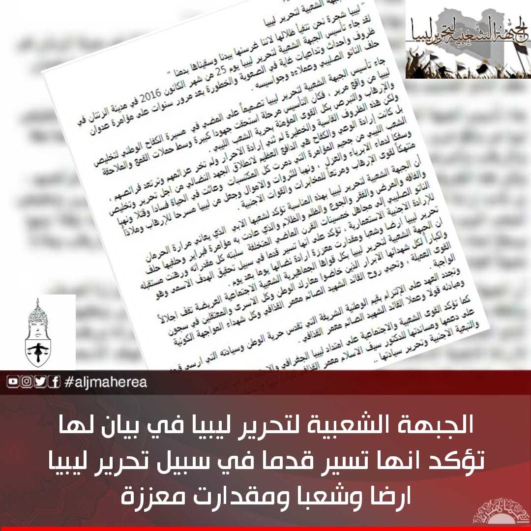 الجبهة الشعبية لتحرير ليبيا في بيان لها تؤكد انها تسير قدما في سبيل تحرير ليبيا ارضا وشعبا ومقدارت معززة
