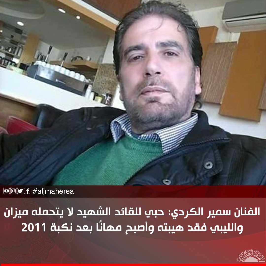 وشدد الفنان سمير الكردي، أن حبه للقائد الشهيد معمر القذافي “ما يشيلاش” أي لا يتحمله ميزان، وأن العلم الأخضر والنظام الجماهيري قضيته.
