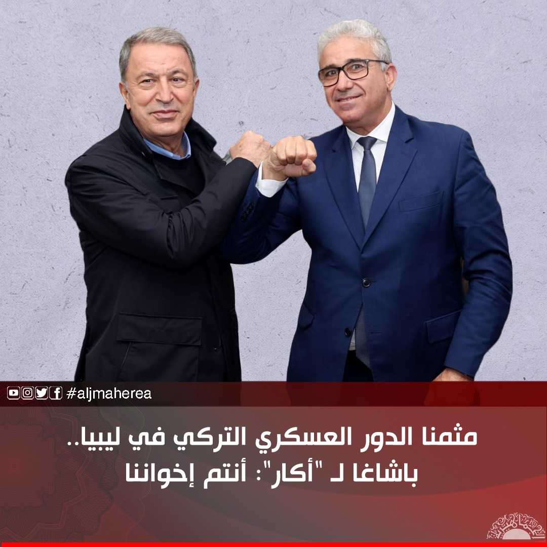 وبحسب الموقع الرسمي لوزارة الدفاع التركية، هنأ الوزير أكار ، وزير الداخلية فتحي باشاغا ، بما يسمى بـ “يوم استقلال ليبيا” في 24 ديسمبر ، قائلا: “لقد أنجزتم أشياء عظيمة ، وآمل أن نأتي بكل هذه الأشياء وأن يواصل إخواننا الليبيون العيش بسلام وأمن وسلام”.