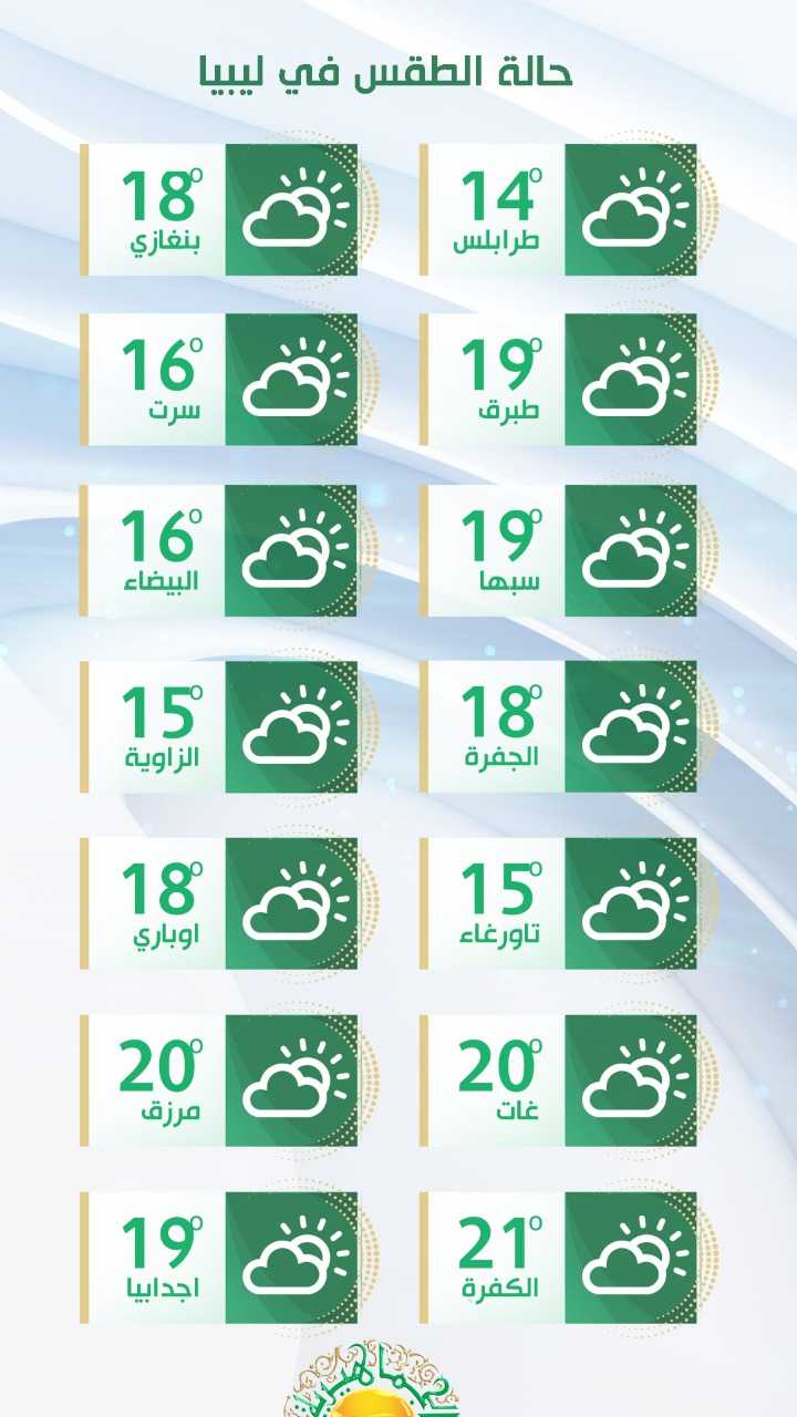أما على مناطق الخليج سرت وبن جواد وسهل بنغازي حتى أمساعد وجالو والجغبوب احتمال سقوط أمطار خفيفة على مناطق سهل بنغازي والجبل الأخضر والرياح جنوبية غربية إلى جنوبية معتدلة تنشط اليوم على مناطق الجبل الأخضر وسهل بنغازي ودرجات الحرارة القصوى تتراوح مابين (17 – 21) مْ ، ولا تتجاوز (15) مْ على مرتفعات الجبل الأخضر.وعلى مناطق الجفرة وسبها وغات وغدامس والحماده ستكون السماء صافية إلى قليلة السحب والرياح متغيرة الاتجاه خفيفة السرعة ودرجات الحرارة القصوى: تتراوح ما بين (17- 20) مْ ولا تتجاوز (14) مْ على غدامس والحمادة وتنخفض ليلا على هذه المناطق الى اقل من (3) درجات مئوية .