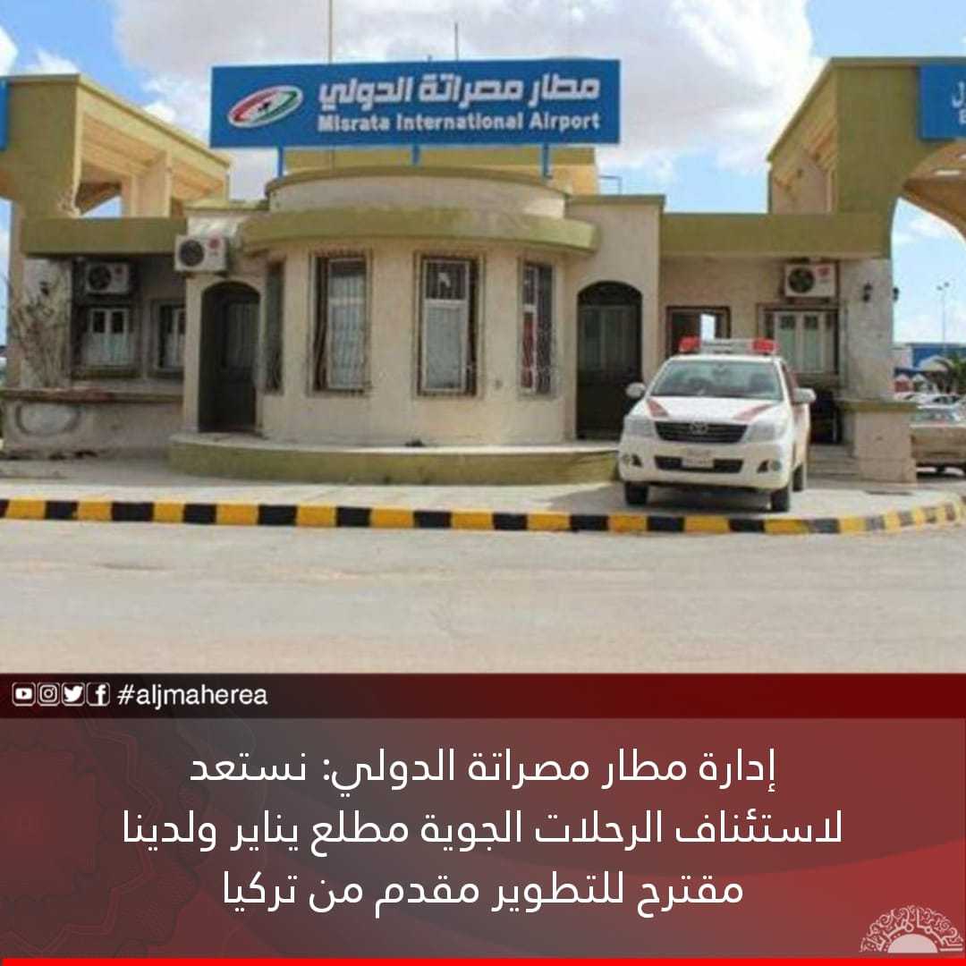 أعلنت إدارة مطار مصراتة الدولي، استعدادها لاستئناف العمل وتسيير الرحلات الجوية مطلع يناير 2021 المقبل.
