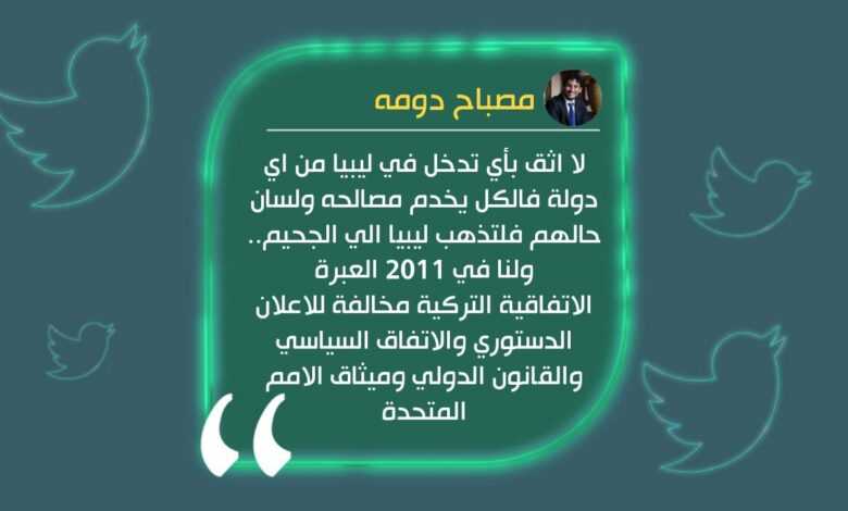 وقال دومة في سلسلة تغريدات له “لا اثق بأي تدخل في ليبيا من اي دولة فالكل يخدم مصالحه ولسان حالهم فلتذهب ليبيا الي الجحيم.. ولنا في 2011 العبرة”