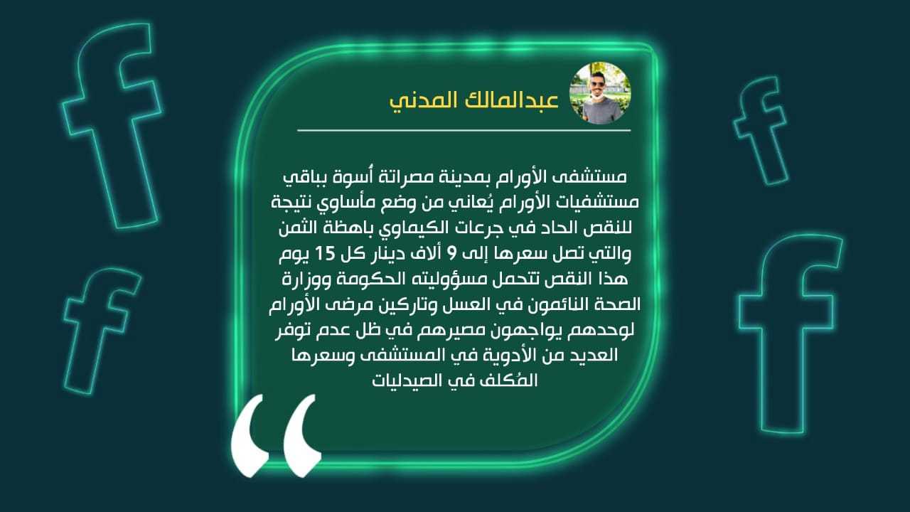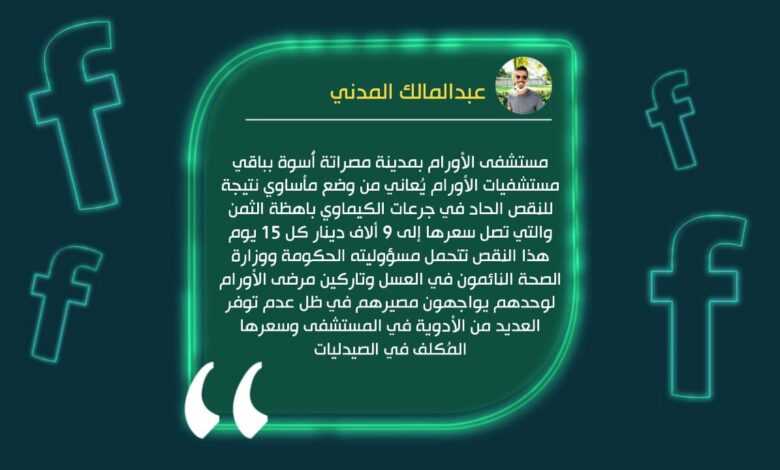 وقال المدني في تدوينة على صفحته على فيسبوك، “مستشفى الأورام بمدينة مصراتة أُسوة بباقي مستشفيات الأورام يُعاني من وضع مأساوي نتيجة للنقص الحاد في جرعات الكيماوي باهظة الثمن والتي تصل سعرها إلى 9 ألاف دينار كل 15 يوم ، وهناك العديد من المرضى سلموا أمرهم لله وباتوا يتوجعون من الألم بسبب عدم قدرتهم شراء الجرعة..!”