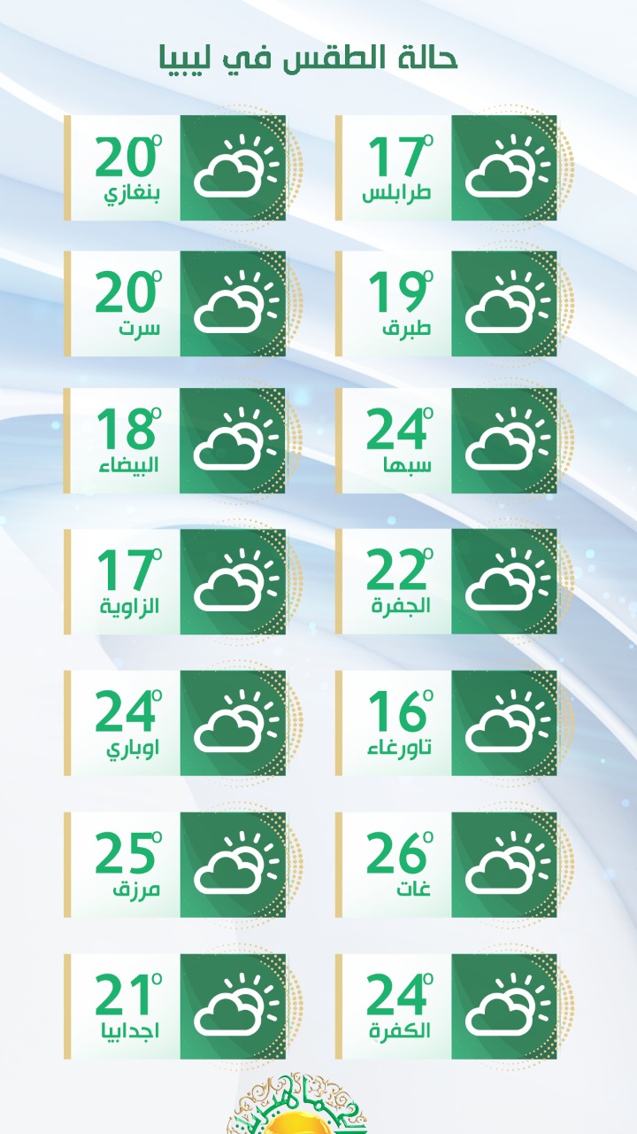 تتكاثر السحب يوم غد على الخليج وسهل بنغازي والجبل الأخضر، والرياح متغيرة الاتجاه إلى جنوبية شرقية، خفيفة إلى معتدلة السرعة، بينما تتراوح درجات الحرارة القصوى بين 15 و21 درجة مئوية على غالبية المناطق.