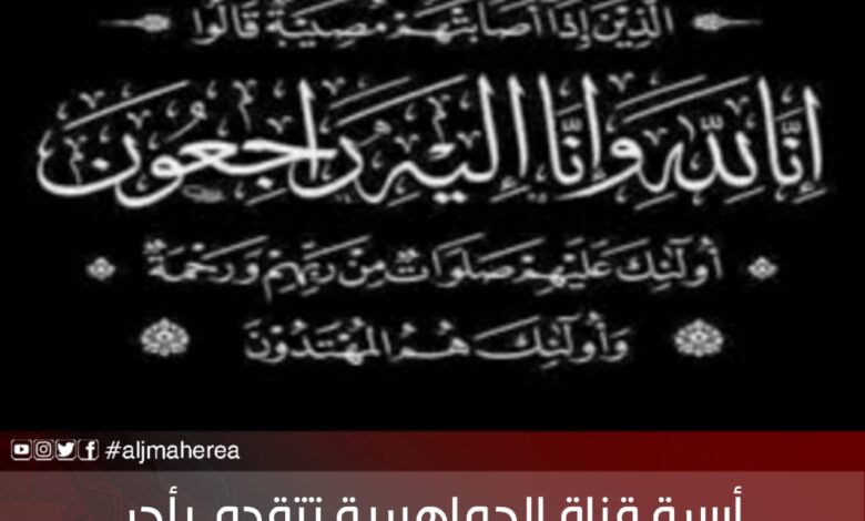 تتقدم أسرة قناة الجماهيرية بأحر التعازي والمواساة القلبية للإعلامي الدكتور يوسف شاكير، على وفاة شقيقته هناهم بعد معاناة مع المرض.