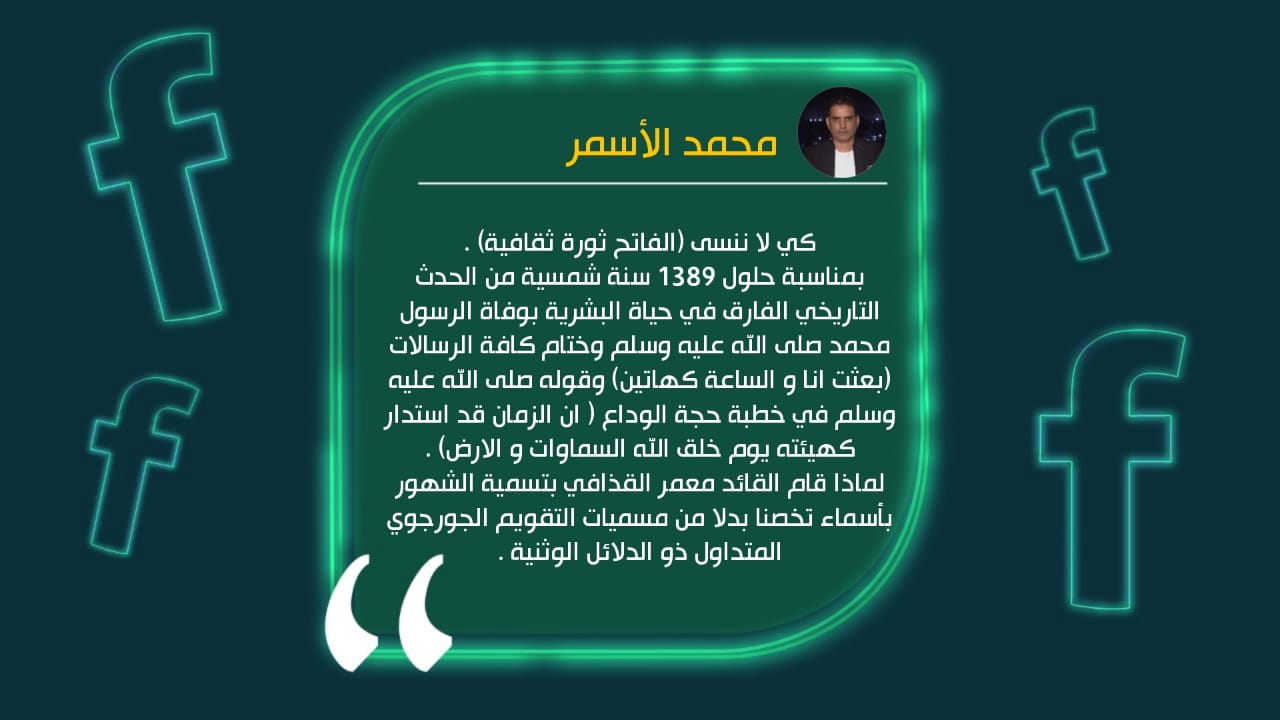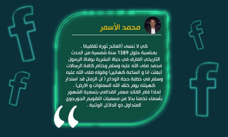 شرح مركز الأمة للدراسات الإستراتيجية محمد الأسمر سبب تسمية القائد الشهيد معمر القذافي للشهور بأسماء تتناسب مع الثقافة العربية الإسلامية، والابتعاد على التسميات ذو الدلالات الوثنية.