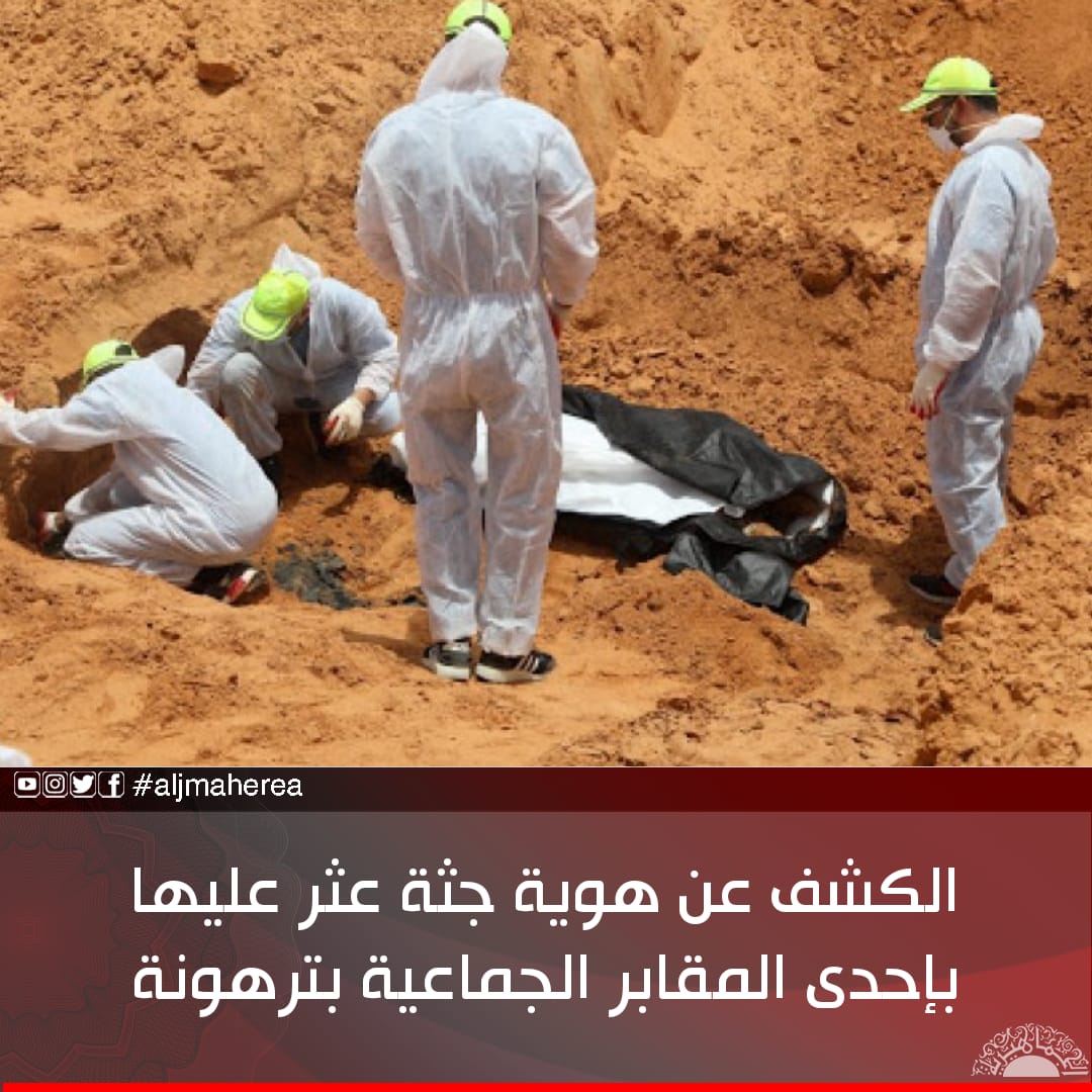 أعلنت وزارة العدل في حكومة الوفاق غير الشرعية التعرف على هوية جثة عثر عليها في المقابر الجماعية بمشروع الربط في مدينة ترهونة.