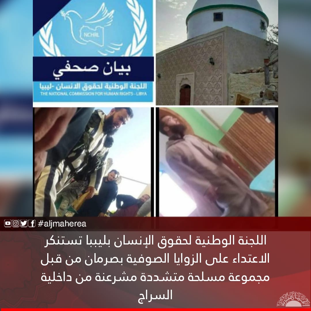 اللجنة الوطنية لحقوق الإنسان بليببا تستنكر الاعتداء على الزوايا الصوفية بصرمان من قبل مجموعة مسلحة متشددة مشرعنة من داخلية السراج