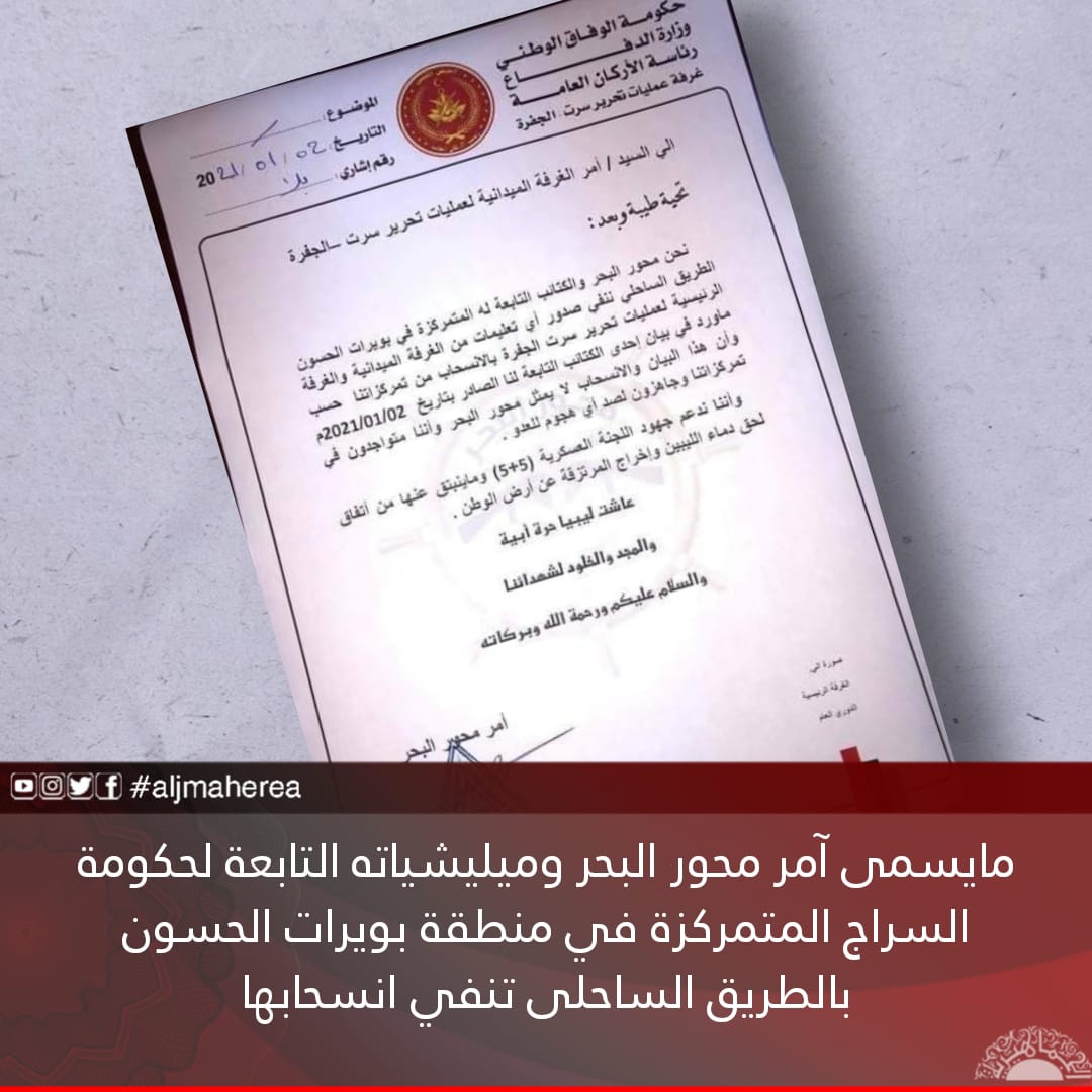 نفى مايسمى آمر محور البحر ومليشياته التابعة لحكومة الوفاق غير الشرعية المتمركزة في منطقة بويرات الحسون بالطريق الساحلى صور اي تعليمات مما اسماه الغرفة الميدانية والغرفة الرئيسية لعمليات تحرير سرت الجفرة بالانسحاب من التمركزات .