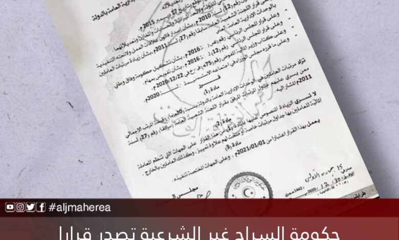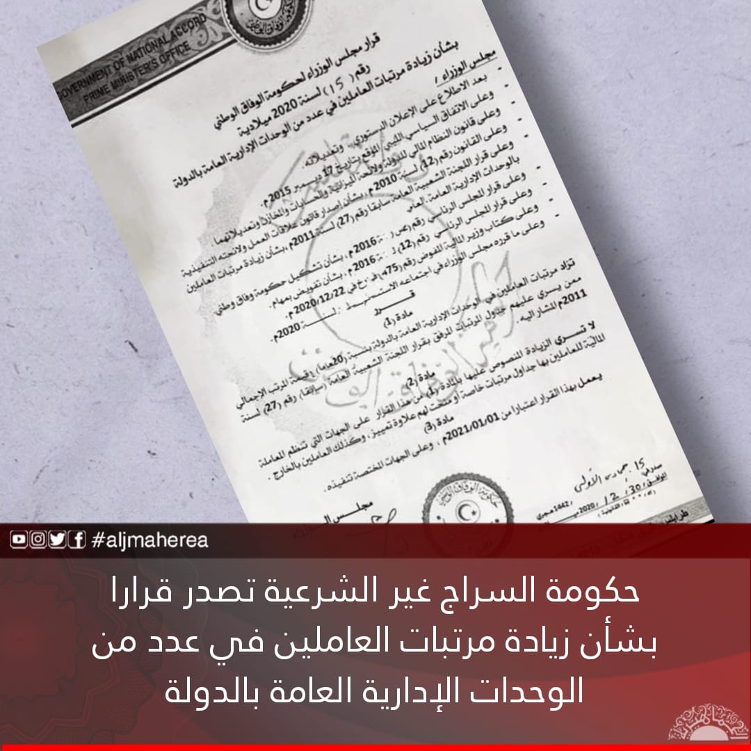 أصدرت حكومة السراج غير الشرعية قرارا بشأن زيادة مرتبات العاملين في عدد من الوحدات الإدارية العامة بالدولة .