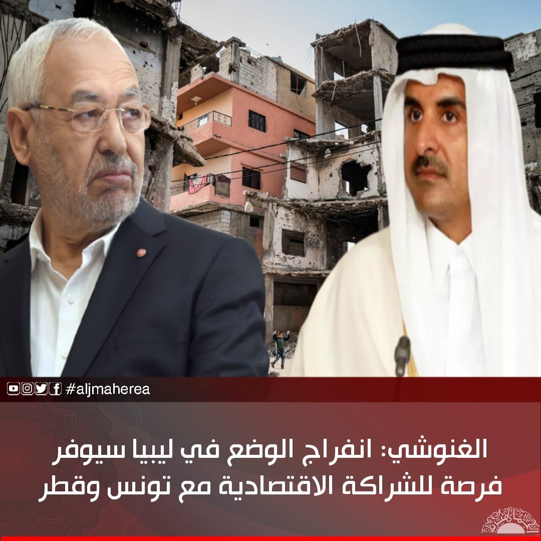 أكد رئيس مجلس نواب الشعب التونسي، ورئيس حركة النهضة الذراع السياسية لجماعة الإخوان المسلمين في تونس، راشد الغنوشي، أن انفراج الوضع في ليبيا سيوفر فرصة مهمة جدا للشراكة الاقتصادية الثلاثية التونسية القطرية الليبية للاستثمار في السلم واعادة البناء في دولة ليبيا.