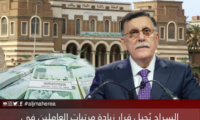 أحال رئيس المجلس الرئاسي غير الشرعي فايز السراج، قرار زيادة مرتبات العاملين في قطاع النفط بنسبة 67% إلى وزارة المالية وفي انتظار تفعيله من قبل مصرف ليبيا المركزي.