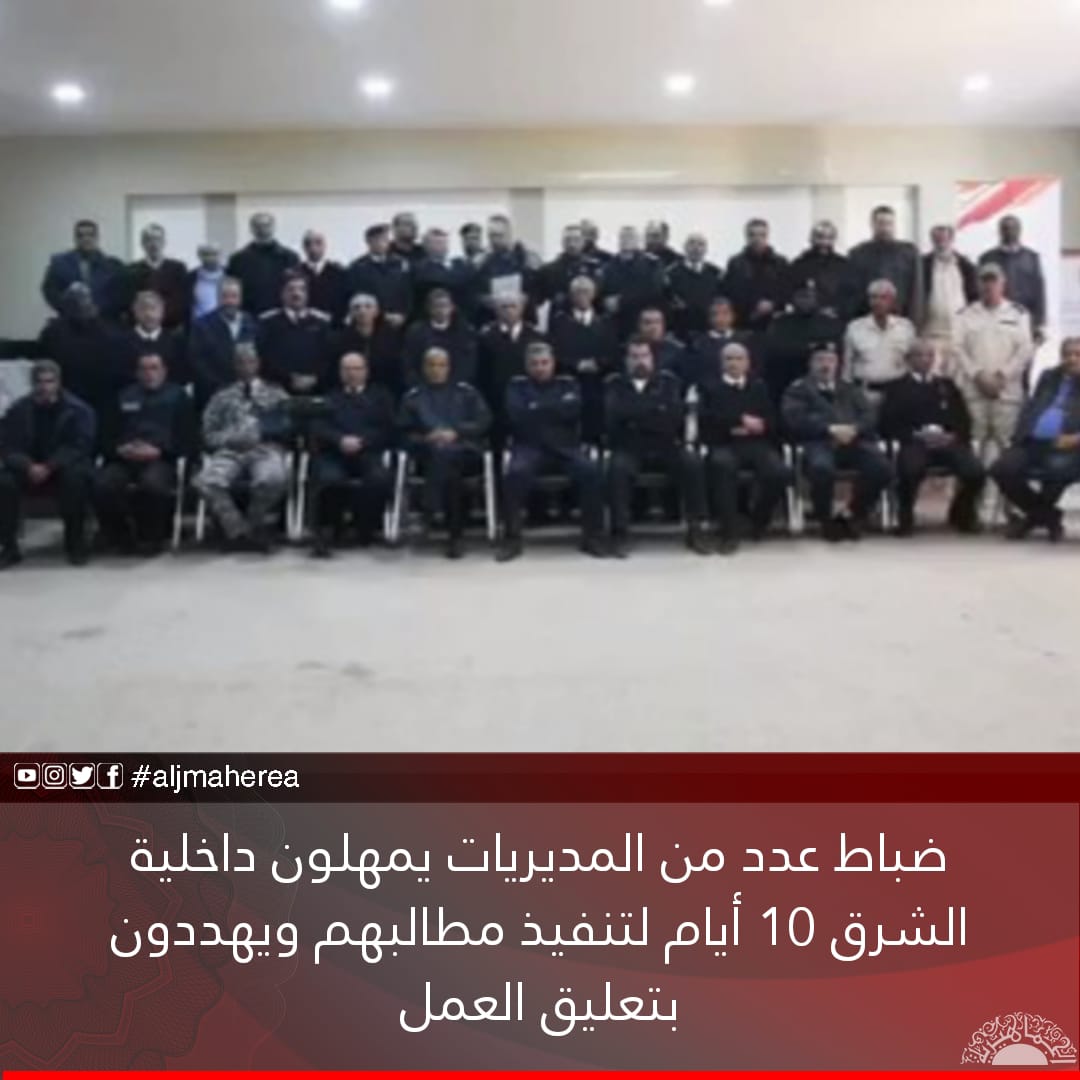 هدد ضباط مديريات طبرق، امساعد، بئر الاشهب، المنافذ، البطنان، بتعليق العمل في هذه المناطق بالصفات، في حال عدم تنفيذ مطالبهم.