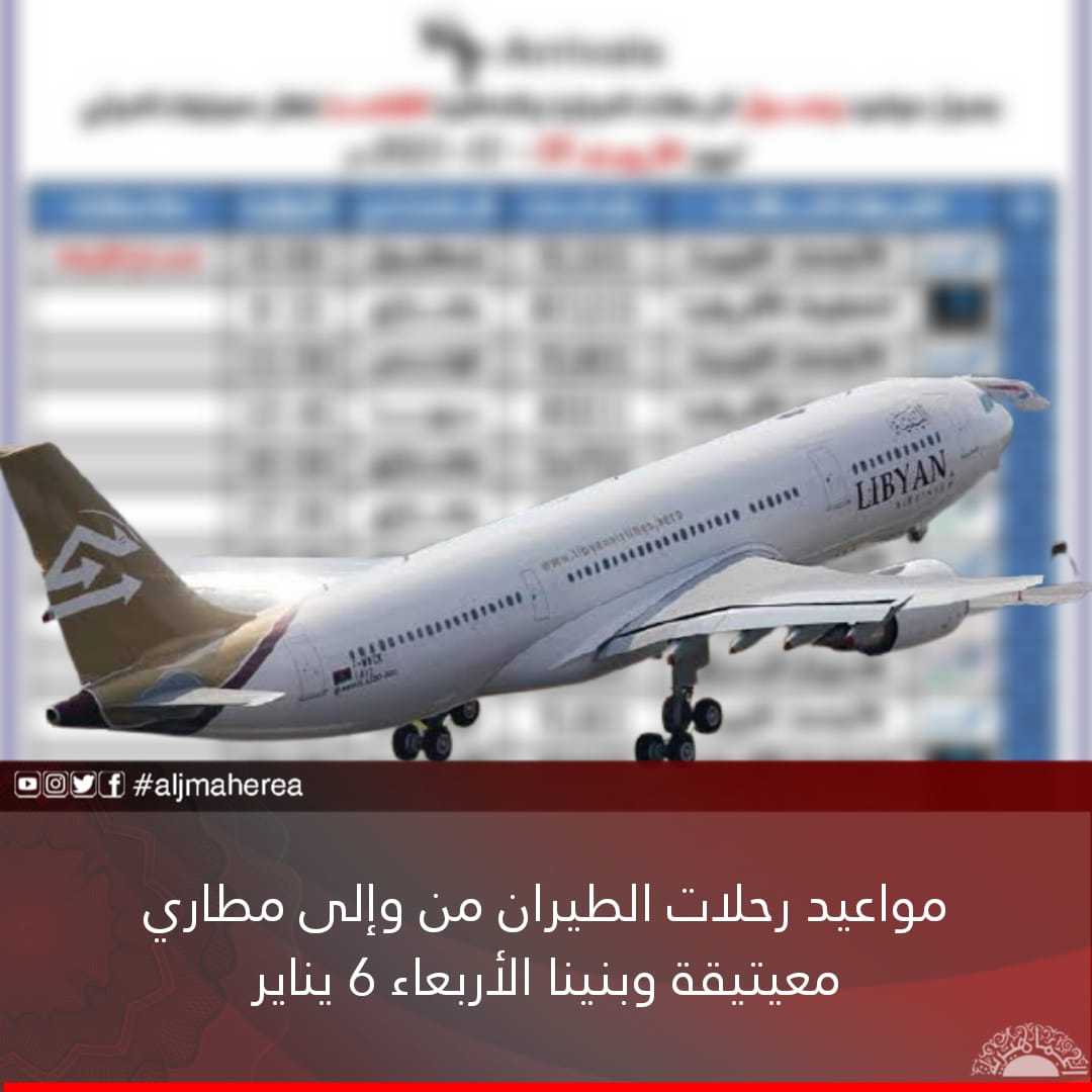 أعلنت إدارة مطاري معيتيقة بالعاصمة طرابلس، وبنينا بمدينة بنغازي، عن مواعيد رحلات الطيران من وإلى المطارين، غدا الأربعاء الموافق 06 يناير 2021.