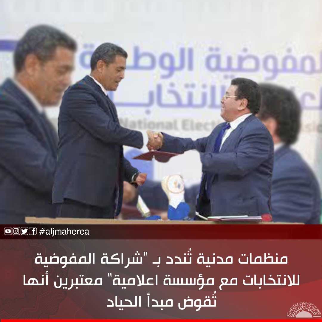أصدرت 21 منظمة مدنية، بياناً رسمياً، أعربت فيه عن رفضها لاتفاق الشراكة الموقع بين المفوضية العليا للانتخابات، و المؤسسة الليبية للإعلام التي يترأسها محمد بعيو .