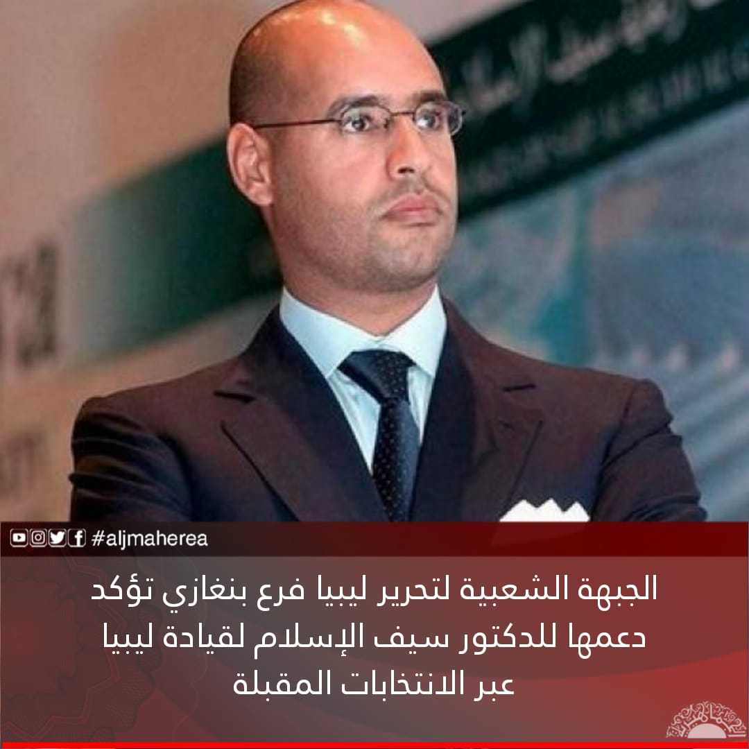 وأكدت الجبهة الشعبية لتحرير ليبيا، فرع بنغازي، دعمها للدكتور سيف الاسلام القذافي، و تفويضه لرئاسة ليبيا.
