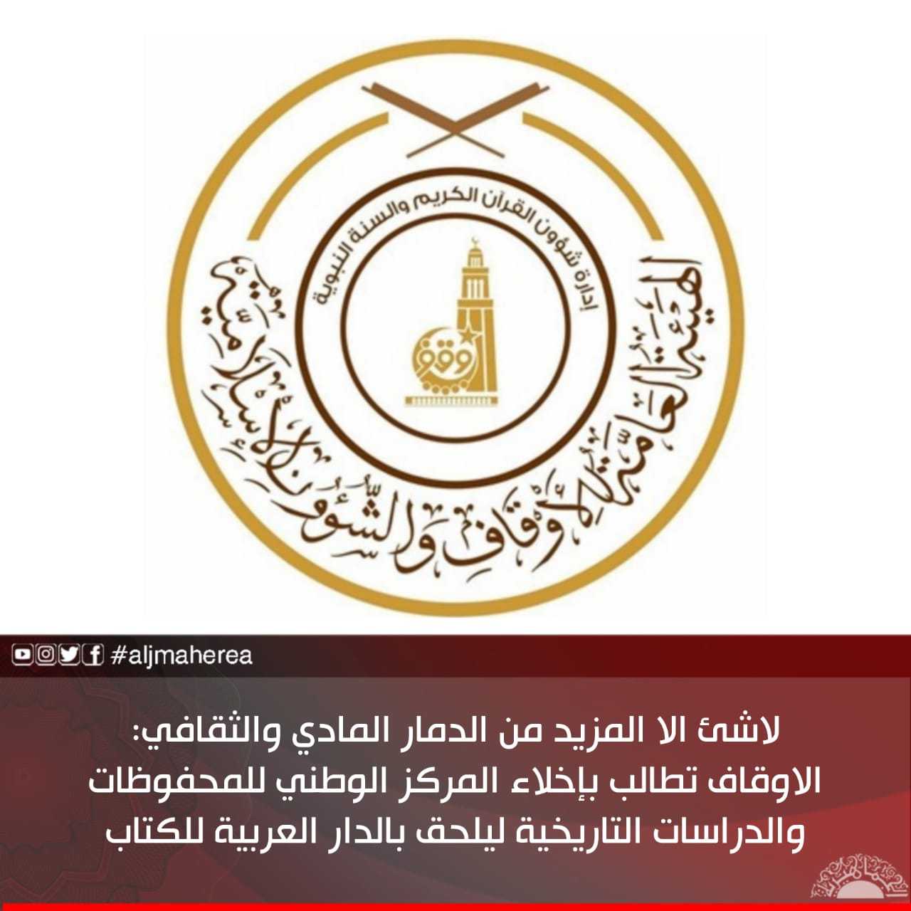طالبت الأوقاف باخلاء المبنى الذي يشغره المركز الوطني للمحفوظات والدراسات التاريخية الذي صنفته منظمة اليونيسكو للثقافة والعلوم ضمن مؤسسات التراث الانساني التي يجب المحافظة عليها وعدم المساس بها .