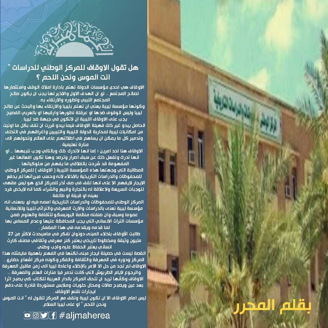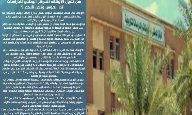 المطالبة التي وجهتها هذه المؤسسة الليبية ( الاوقاف ) للمركز الوطني للمحفوظات والدراسات التاريخية بالاخلاء لانه وحسب مبرراتها لم يدفع الايجار لايفهم الا على انها تقف في صف آخر للمركز الذي هو ليس مقهى للوجبات السريعة ولاعلاقة له بالتجارة والبيع والشراء كما انه لايخص فرد بعينه او قبيلة او طائفة .