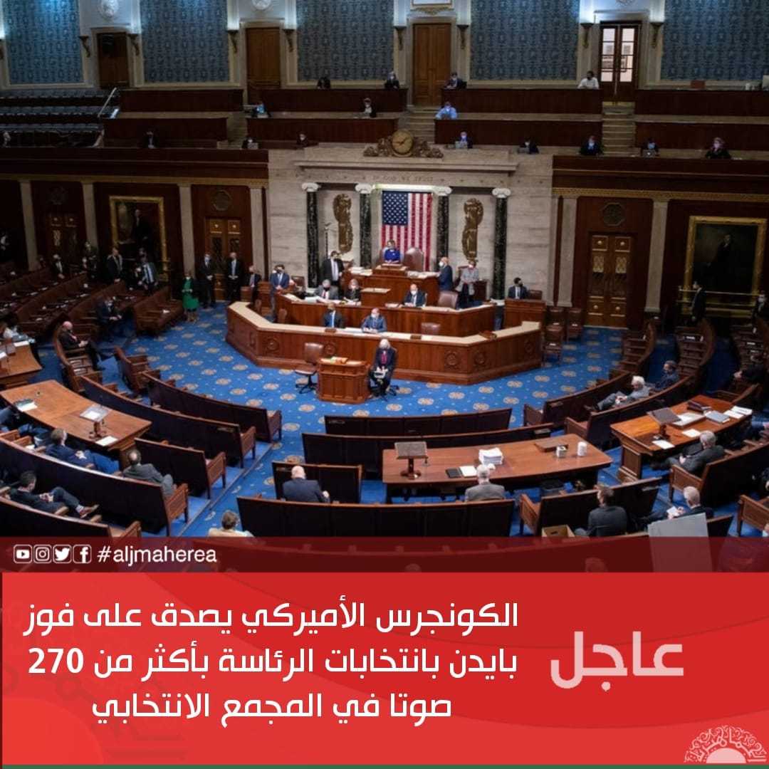 عاجل// الكونجرس الأميركي يصدق على فوز بايدن بانتخابات الرئاسة بأكثر من 270 صوتا في المجمع الانتخابي