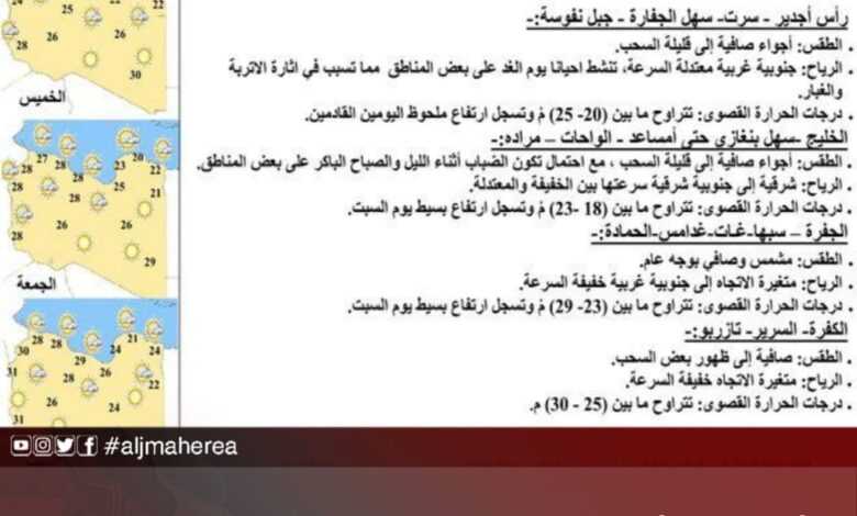 الأرصاد: الأجواء دافئة في عموم ليبيا وانخفاض درجات الحرارة تدريجيًا نهاية الأسبوع
