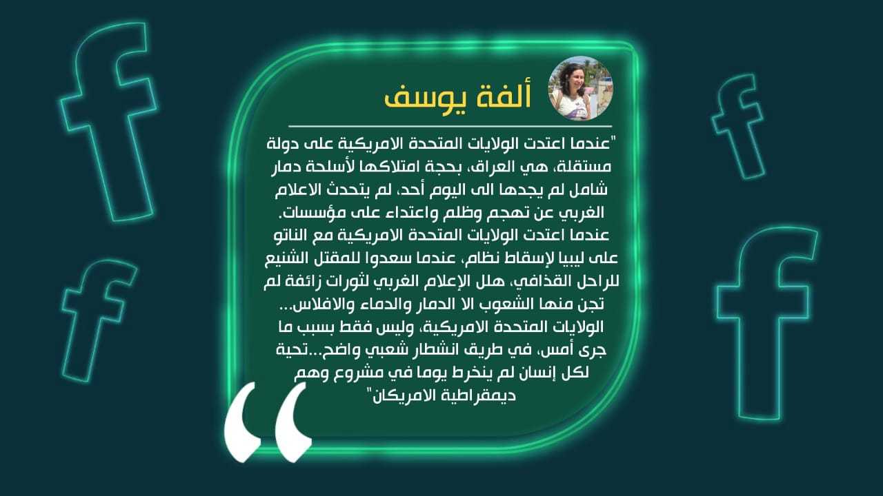 “عندما اعتدت الولايات المتحدة الأمريكية على دولة مستقلة، هي العراق، بحجة امتلاكها لأسلحة دمار شامل لم يجدها الى اليوم أحد، لم يتحدث الاعلام الغربي عن تهجم وظلم واعتداء على مؤسسات.