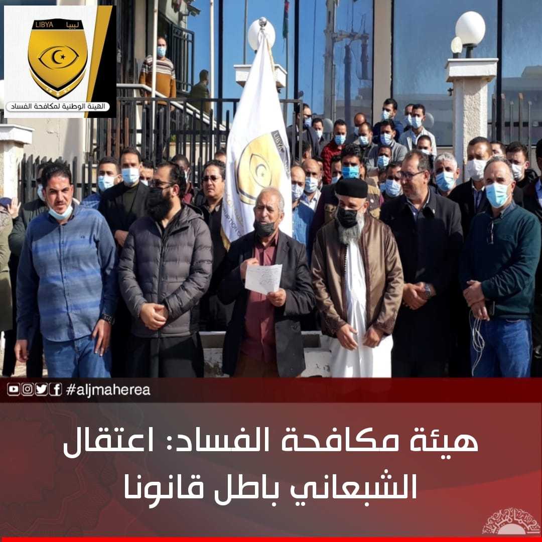 وحمّلت الهيئة كافة الجهات المعنية المسؤولية القانونية المترتبة على هذا الإجراء، مطالبة بالإفراج فورا على الموظف بالهيئة الدكتور مجدي الشارف الشبعاني مدير ادارة الشؤون القانونية ونائب رئيس فريق الخبراء الحكومي المعتمد والمعني بتنفيذ اتفاقية الأمم المتحدة لمكافحة الفساد لدولة ليبيا.