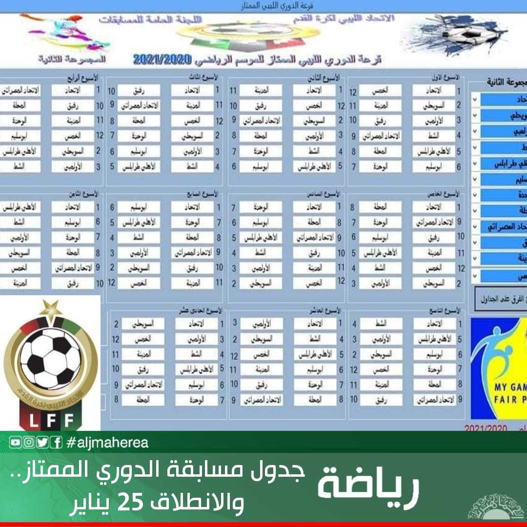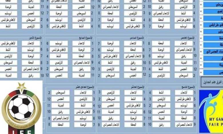 ووفقا للجدول المعلن، يقام ديربي بنغازي بين فريقي الأهلي بنغازي والنصر في الأسبوع الثالث، بينما جاءت مواجهة فريقي الاتحاد والأهلي طرابلس في الأسبوع الثامن من عمر المسابقة