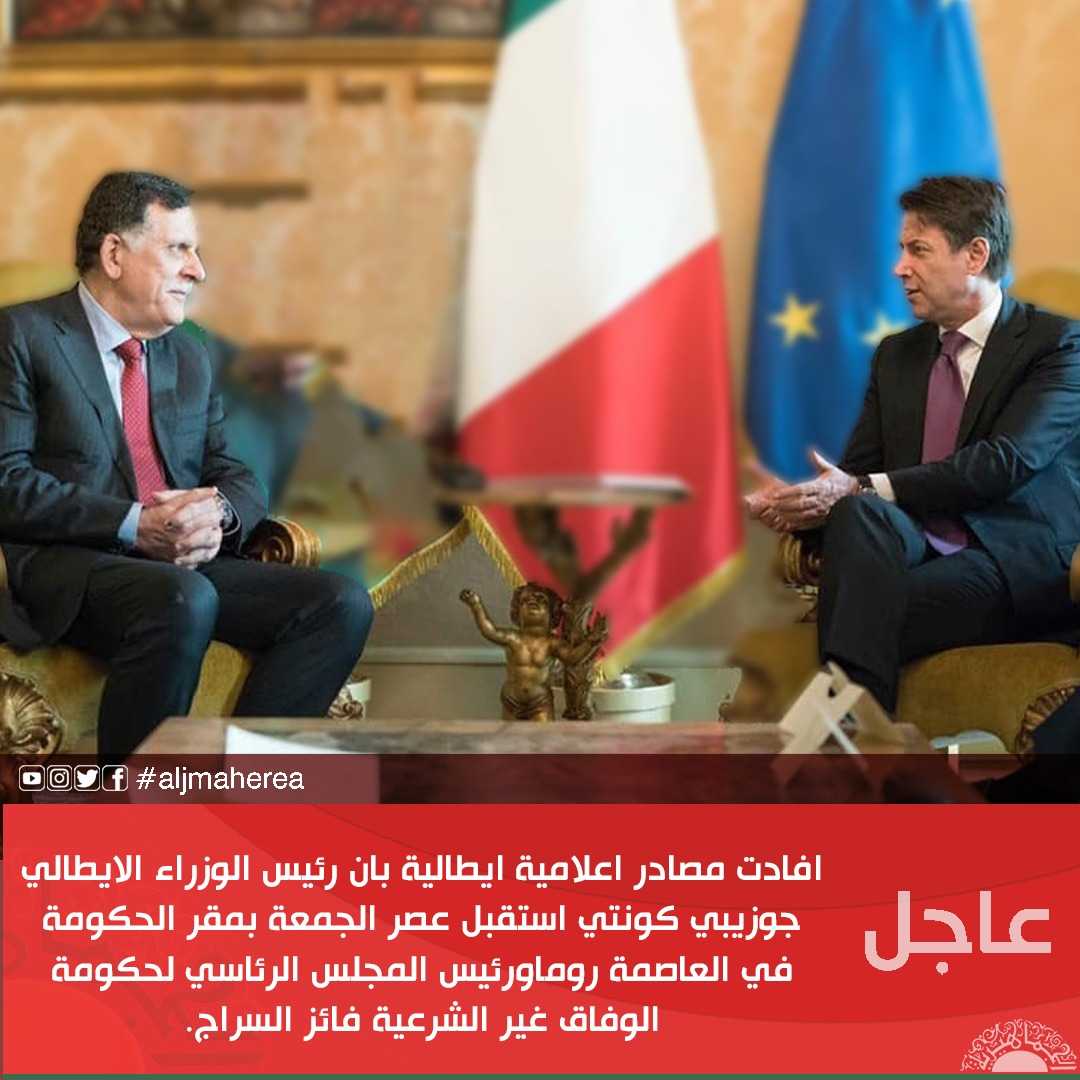 عاجل // افادت مصادر اعلامية ايطالية بان رئيس الوزراء الايطالي جوزيبي كونتي استقبل عصر الجمعة بمقر الحكومة في العاصمة روماورئيس المجلس الرئاسي لحكومة الوفاق غير الشرعية فائز السراج.