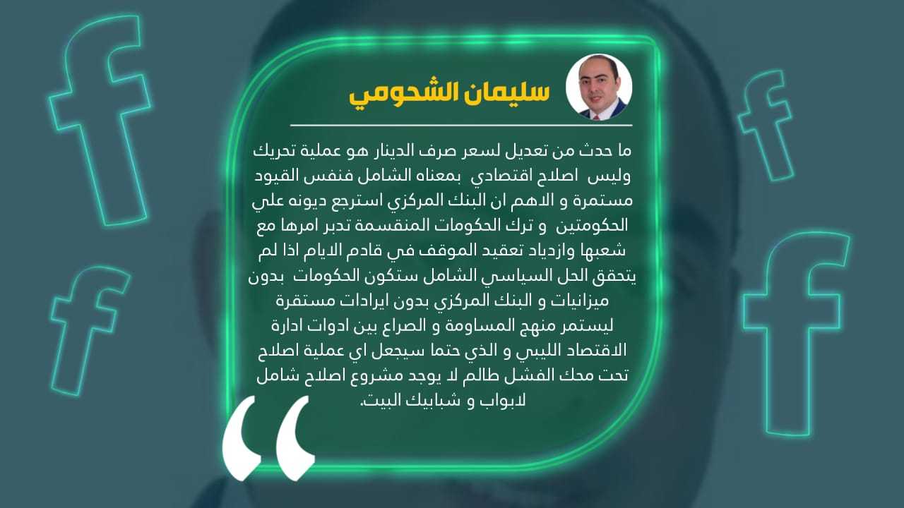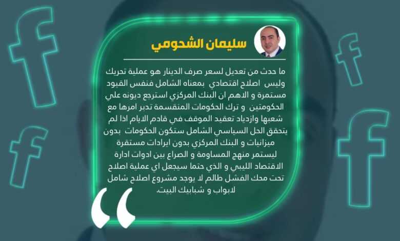 في قناعتي الراسخة ان ما حدث من تعديل لسعر صرف الدينار هو عملية تحريك وليس اصلاح اقتصادي بمعناه الشامل فنفس القيود مستمرة و الاهم ان البنك المركزي استرجع ديونه علي الحكومتين و ترك الحكومات المنقسمة تدبر امرها مع شعبها وازدياد تعقيد الموقف في قادم الايام اذا لم يتحقق الحل السياسي الشامل ستكون الحكومات بدون ميزانيات و البنك المركزي بدون ايرادات مستقرة ليستمر منهج المساومة و الصراع بين ادوات ادارة الاقتصاد الليبي و الذي حتما سيجعل اي عملية اصلاح تحت محك الفشل طالم لا يوجد مشروع اصلاح شامل لابواب و شبابيك البيت.