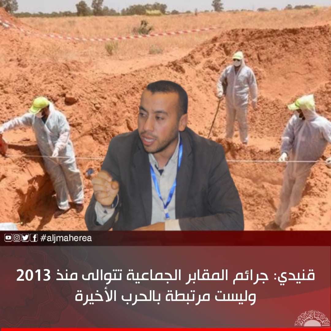 أفاد أستاذ القانون الدولي في جامعة مصراتة، موسى القنيدي، بأن ماتم الكشف عنه عن طريق الهيئة العامة للبحث والتعرف على المفقودين، هو عبارة عن حماقة من مسلسل مستمر من المقابر الجماعية التي يتم الكشف عنها تباعًا منذ يونيو الماضي بتاريخ دخول حكومة السراج إلى ترهونة