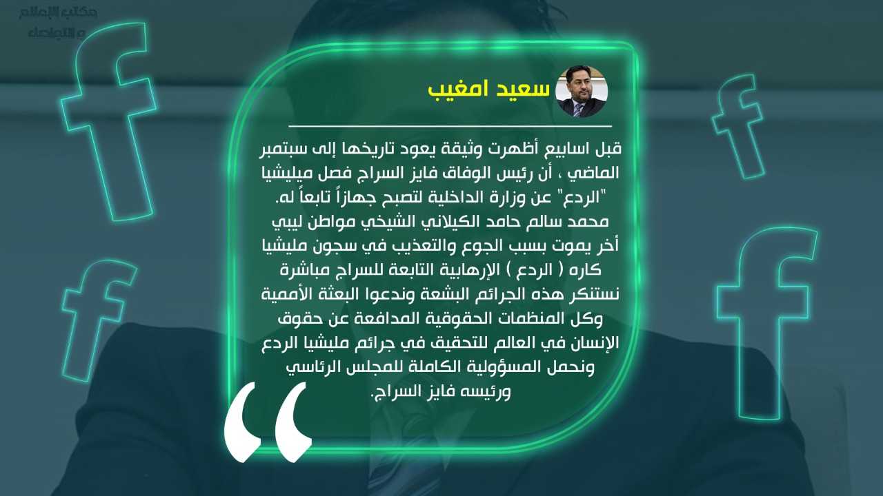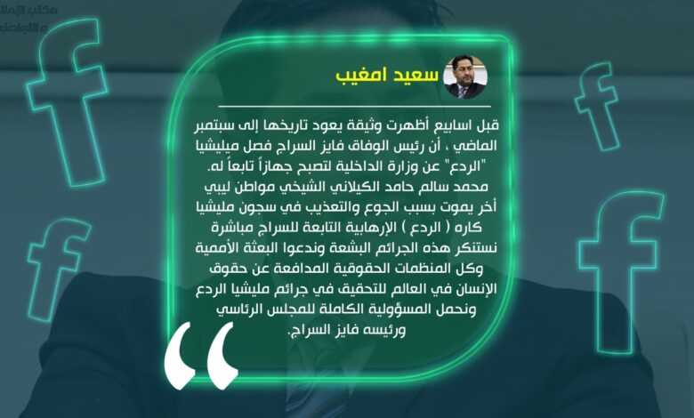 ولفت أمغيب إلى ظهور وثيقة منذ أسابيع يعود تاريخها إلى سبتمبر الماضي، كشفت عن أن رئيس حكومة الوفاق غير الشرعية فايز السراج فصل ميليشيا “الردع” عن وزارة الداخلية لتصبح جهازاً تابعاً له.