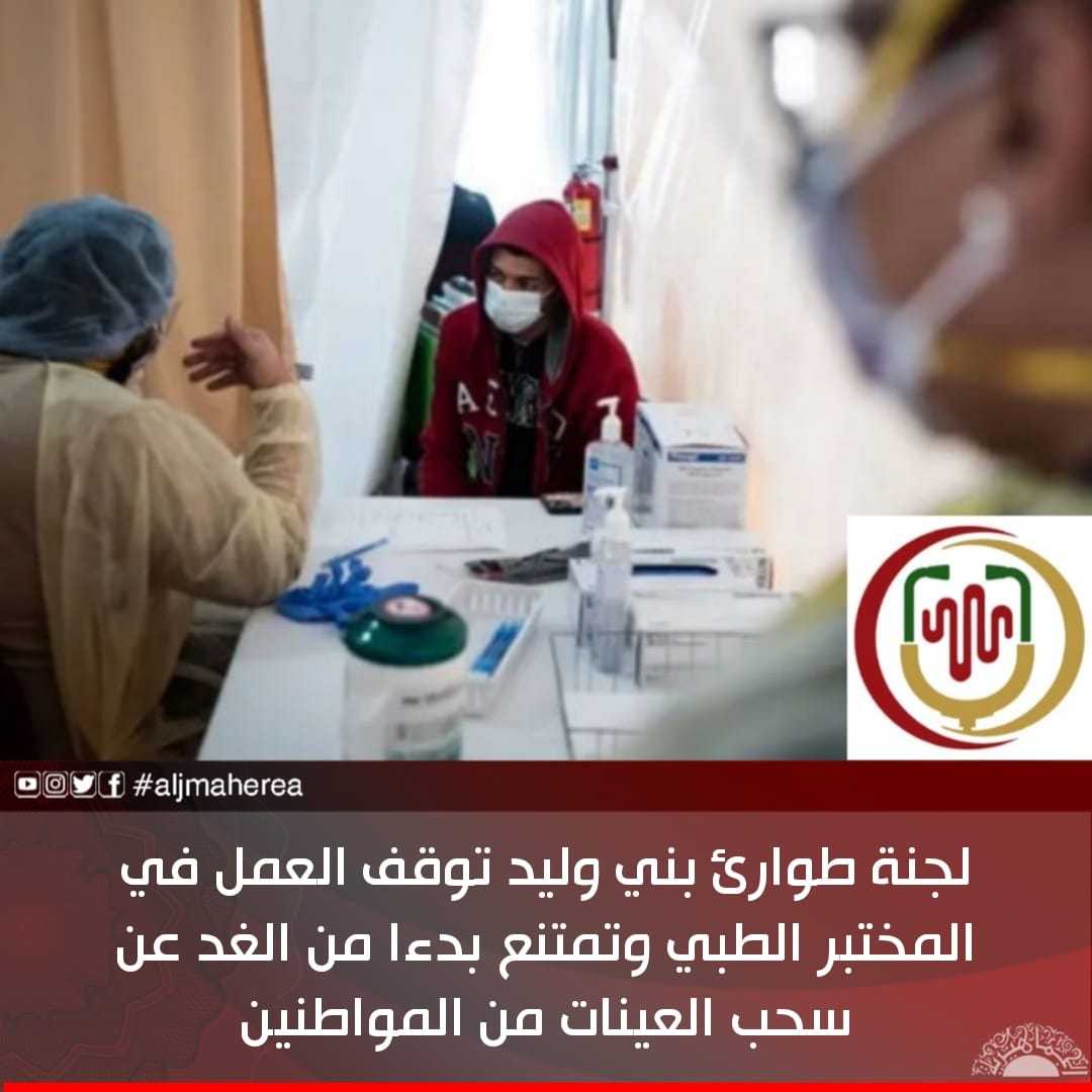قررت لجنة الطوارئ الصحية بإدارة الخدمات الصحية في بني وليد إيقاف العمل داخل المختبر الطبي لنفاذ المشغلات الخاصة بتحليل فيروس كورونا.