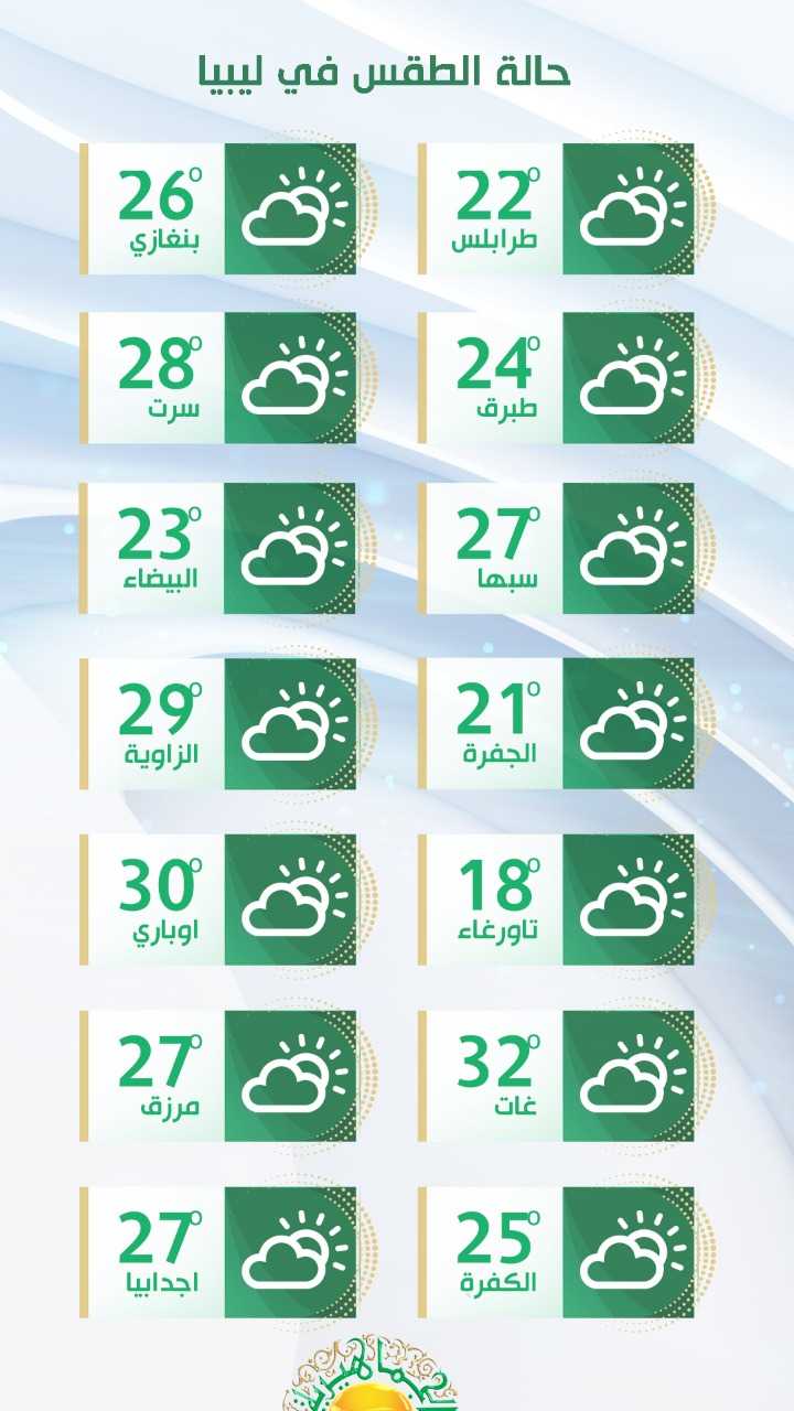 الحرارة المتوقعة تتراوح بين 27 و31 درجة، وتصل على غدامس إلى 23 درجة، وتسجل انخفاضا غدا.