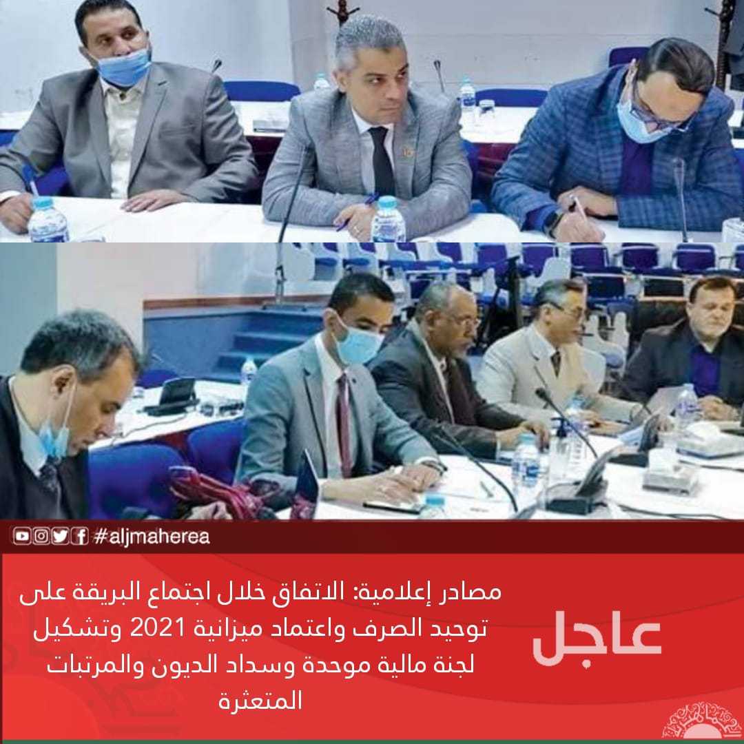 عاجل// مصادر إعلامية: الاتفاق خلال اجتماع البريقة على توحيد الصرف واعتماد ميزانية 2021 وتشكيل لجنة مالية موحدة وسداد الديون والمرتبات المتعثرة