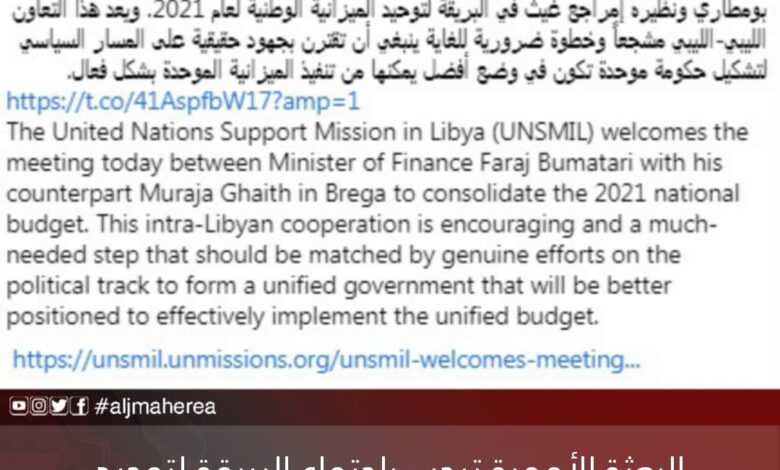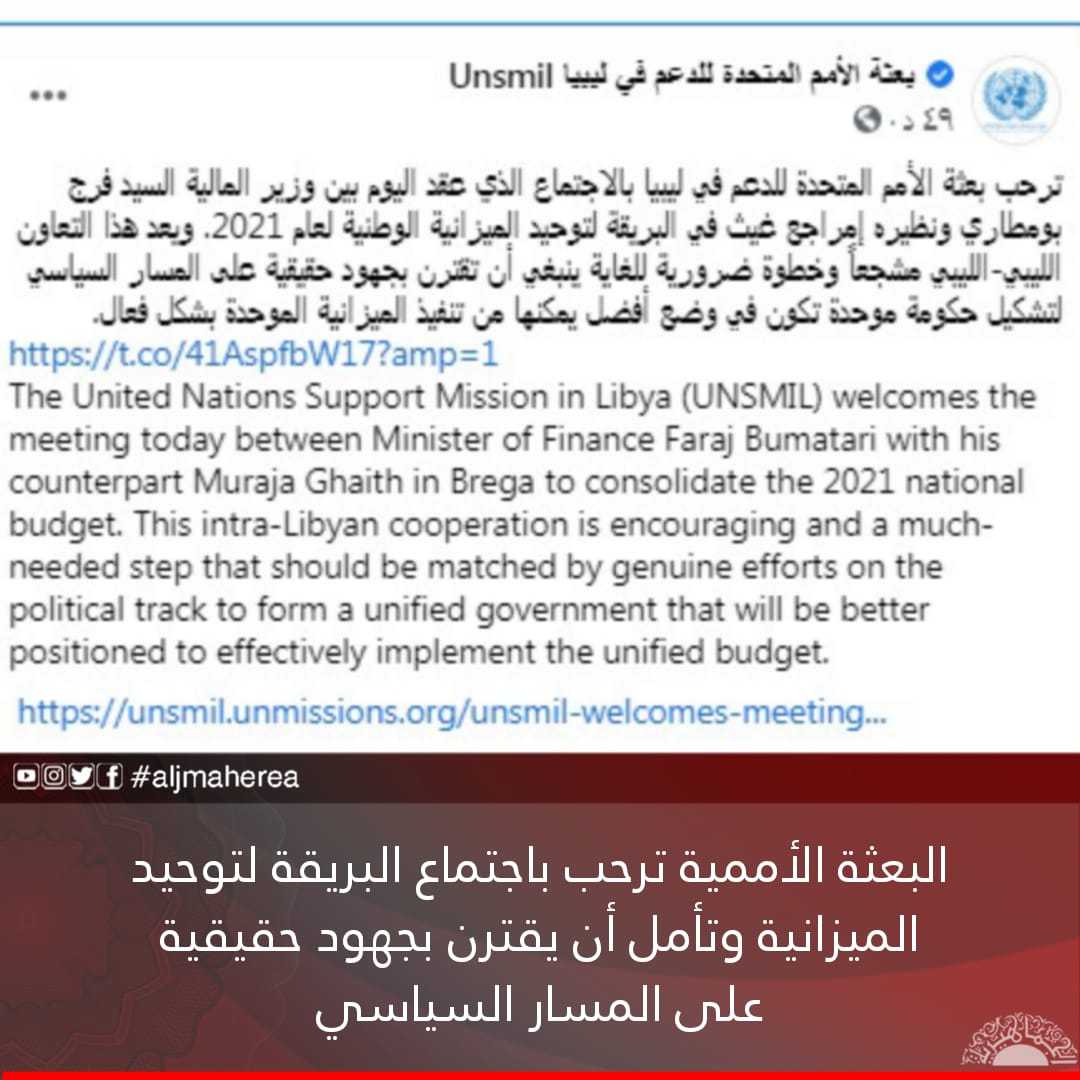 أعلنت البعثة الأممية للدعم في ليبيا، ترحيبها بالاجتماع الذي عقد اليوم، بين وزير مالية السراج، فرج بومطاري ونظيره في حكومة الشرق، إمراجع غيث في البريقة، بغرض توحيد الميزانية لعام 2021.