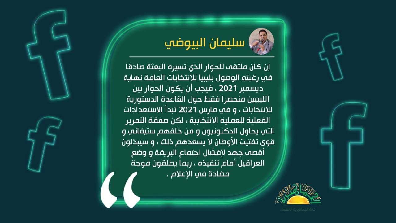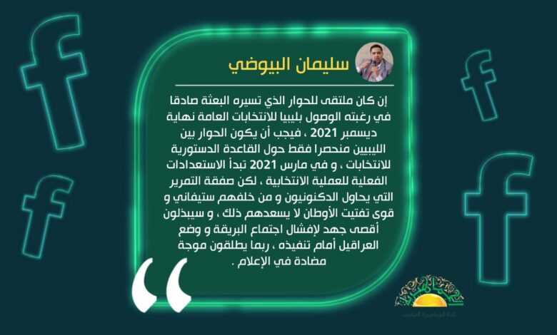 وأضاف “أن كان ملتقى للحوار الذي تسيره البعثة صادقا في رغبته الوصول بليبيا للانتخابات العامة نهاية ديسمبر 2021 ، فيجب أن يكون الحوار بين الليبيين منحصرا فقط حول القاعدة الدستورية للانتخابات ، و في مارس 2021 تبدأ الاستعدادات الفعلية للعملية الانتخابية ، لكن صفقة التمرير التي يحاول الدكنونيون و من خلفهم ستيفاني و قوى تفتيت الأوطان لا يسعدهم ذلك ، و سيبذلون أقصى جهد لإفشال اجتماع البريقة و وضع العراقيل أمام تنفيذه ، ربما يطلقون موجة مضادة في الإعلام “.