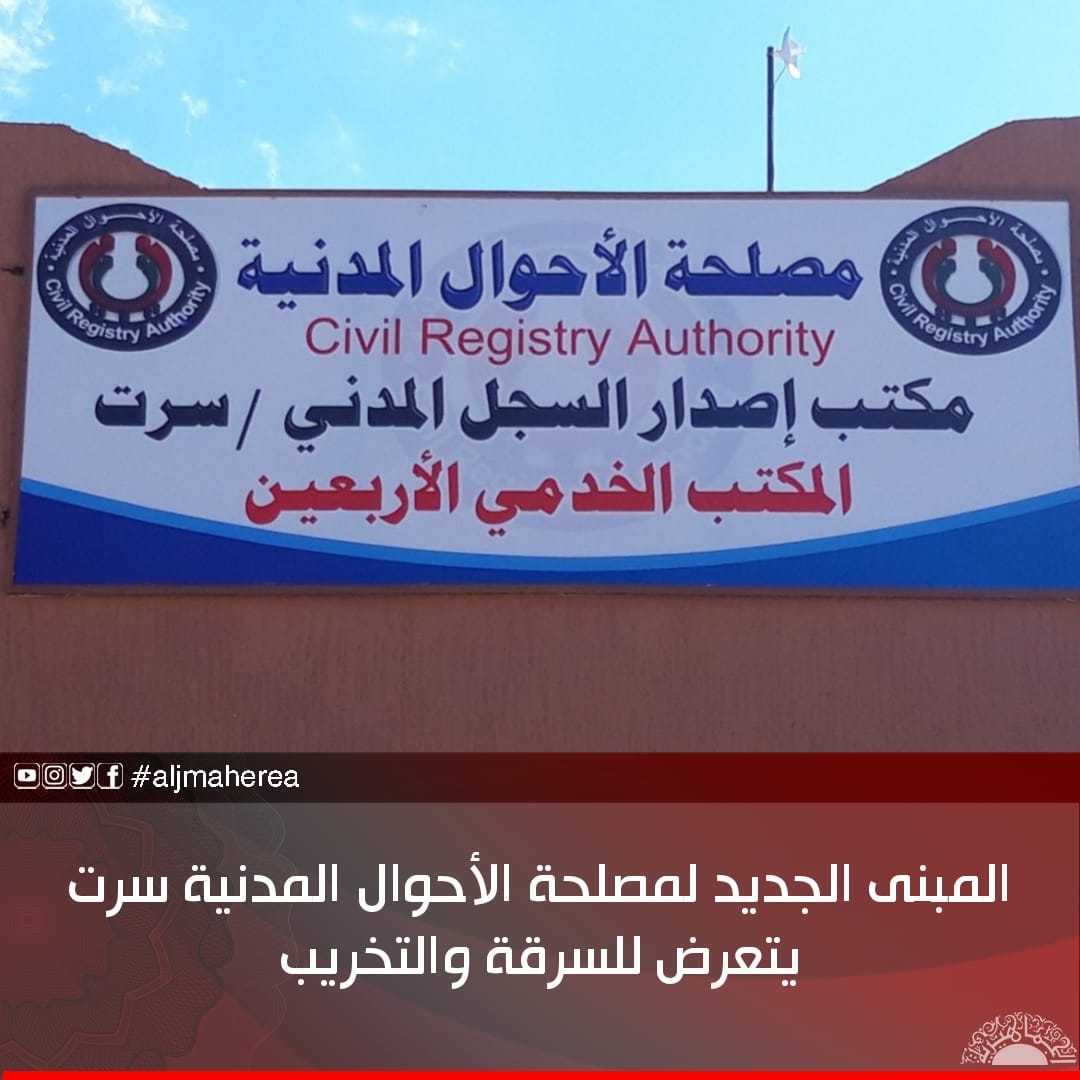 أكدت مصادر تعرض المبنى الجديد لمصلحة الأحوال المدنية (السجل المدني) بسرت لأعمال تخريبية، وسرقات من قبل مجهولين.