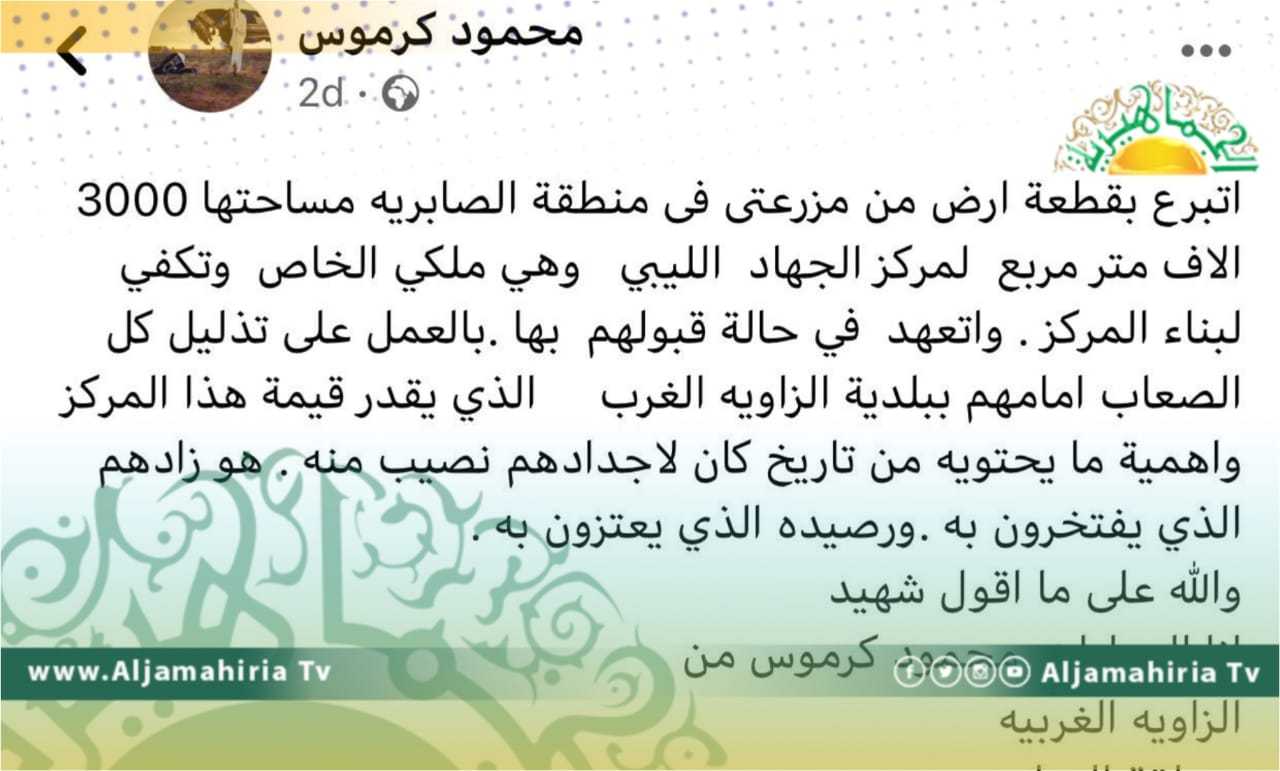 كتب مواطن ليبي منشورًا عبر موقع التواصل الاجتماعي فيسبوك يُعلن فيه عن نيتهِ، للتبرع بقطعة أرض لصالح مركز الجهاد الليبي.