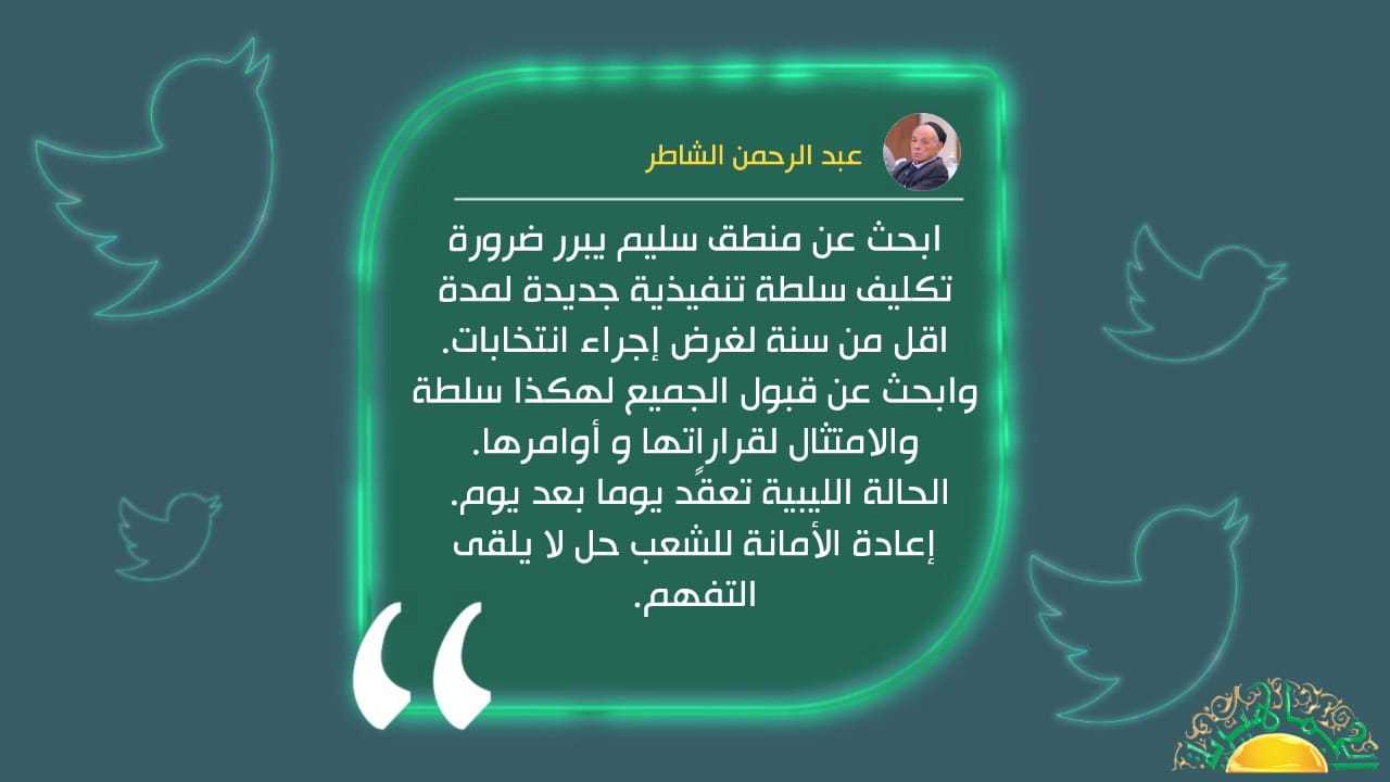 وقال الشاطر في تغريدة له على تويتر: “ابحث عن منطق سليم يبرر ضرورة تكليف سلطة تنفيذية جديدة لمدة اقل من سنة لغرض إجراء انتخابات، وابحث عن قبول الجميع لهكذا سلطة والامتثال لقراراتها و أوامرها”.