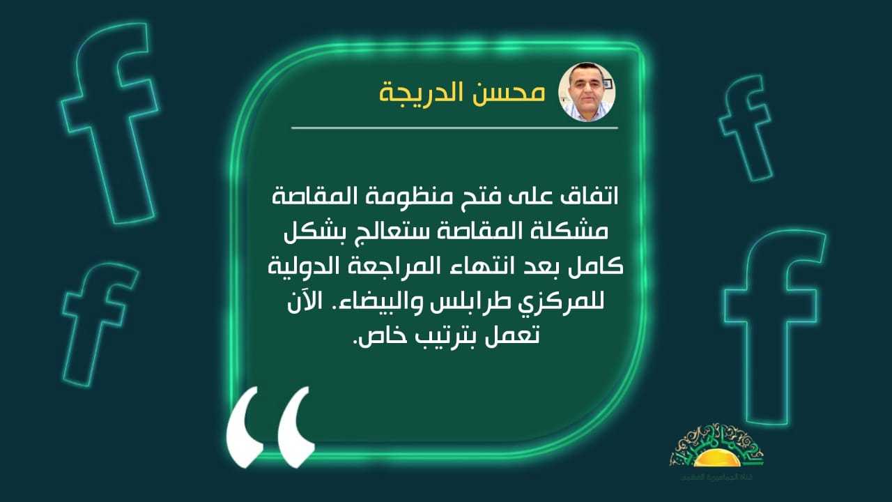 وأعلن الدريجة في تدوينة على صفحته على فيسبوك، عن الاتفاق على فتح منظومة المقاصة، مضيفا في تدوينة أخرى أن “مشكلة المقاصة ستعالج بشكل كامل بعد انتهاء المراجعة الدولية للمركزي طرابلس والبيضاء”.