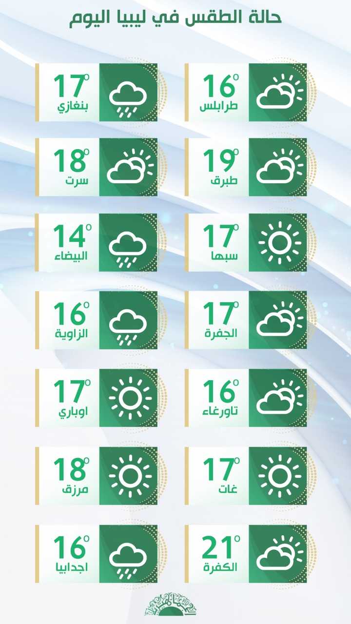– فرصة سقوط أمطار متفرقة وتكون جيدة إلى غزيرة احيانا على مناطق إجدابيا- سهل بنغازي ومناطق الجبل الأخضر، تصحبها خلايا من السحب الرعدية مما يتسبب في تراكم المياه في المناطق المنخفضة وجريان بعض الأودية.