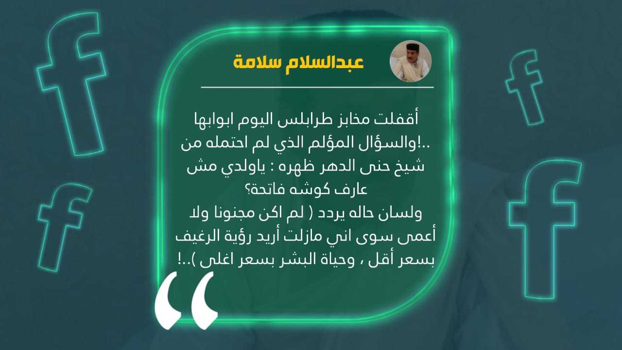عبدالسلام سلامة مُعلقًا على أزمة المخابز في طرابلس 5 سنوات ago مقالات ذات صلة عقيلة صالح: ليبيا لن تقبل اتفاقيات بحرية بدون شرعية دستورية الليبية لحقوق الإنسان: “الحوار المهيكل” مسار عبثي لإضاعة الوقت وشرعنة استمرار الأزمة الأرصاد: الأجواء معتدلة اليوم على أغلب مناطق البلاد، مع فرصة سقوط أمطار متفرقة