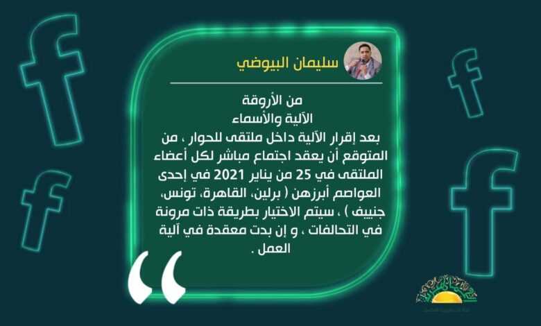 وقال البيوضي في تدوينة له على فيسبوك عنونها بـ “من الأروقة .. الآلية والأسماء” إنه بعد إقرار الآلية داخل ملتقى للحوار ، من المتوقع أن يعقد اجتماع مباشر لكل أعضاء الملتقى في 25 من يناير 2021 في إحدى العواصم أبرزهن ( برلين، القاهرة، تونس، جنييف ) ، سيتم الاختيار بطريقة ذات مرونة في التحالفات ، و إن بدت معقدة في آلية العمل .