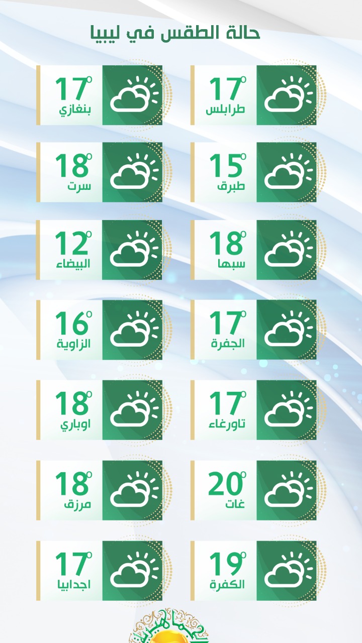 وعلى مناطق رأس أجدير حتى مصراتة وسهل الجفارة وجبل نفوسة ستكون الأجواء صافية إلى قليلة الغيوم والرياح جنوبية إلى جنوبية شرقية معتدلة السرعة ودرجات الحرارة القصوى ما بين (15- 19) مْ ولا تتجاوز (13) مْ على المرتفعات الجبلية، وتميل للاعتدال النسبي من يوم الغد.