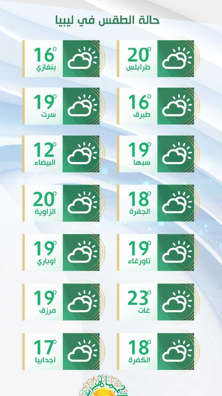 وأفاد المركز، أن الطقس في رأس أجدير – سرت – سهل الجفارة – جبل نفوسة أجواء صافية إلى قليلة الغيوم. مشيرا إلى أن الرياح تكون جنوبية غربية معتدلة السرعة تنشط يوم السبت على المناطق الساحلية ودرجات الحرارة القصوى مابين (14 – 20) درجة مئوية.