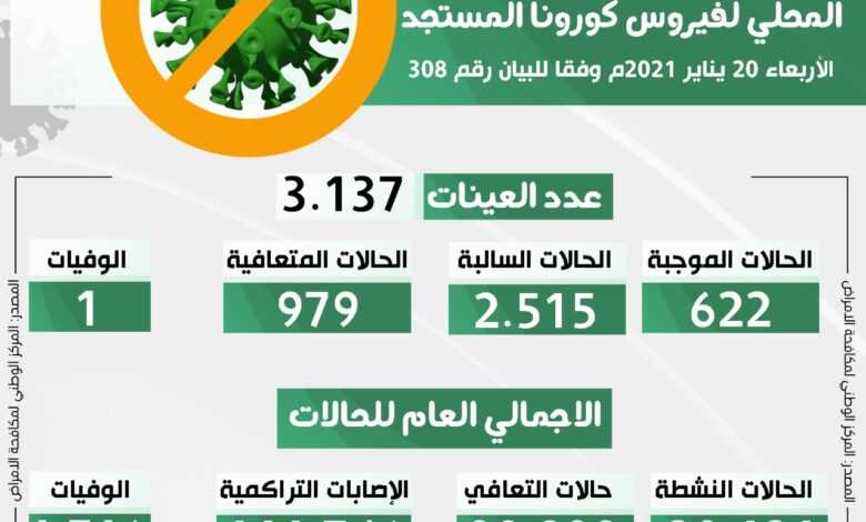 التحديث اليومي للوضع الوبائي المحلي لفيروس كورونا المستجد ليوم الاربعاء 20 يناير 2021 م وفقا للبيان رقم (308)