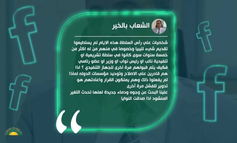 أكد عضو مجلس نواب طبرق، الشعاب بالخير، ضرورة البحث عن دماء جديدة لتولي المناصب القيادية لإحداث التغيير المنشود.