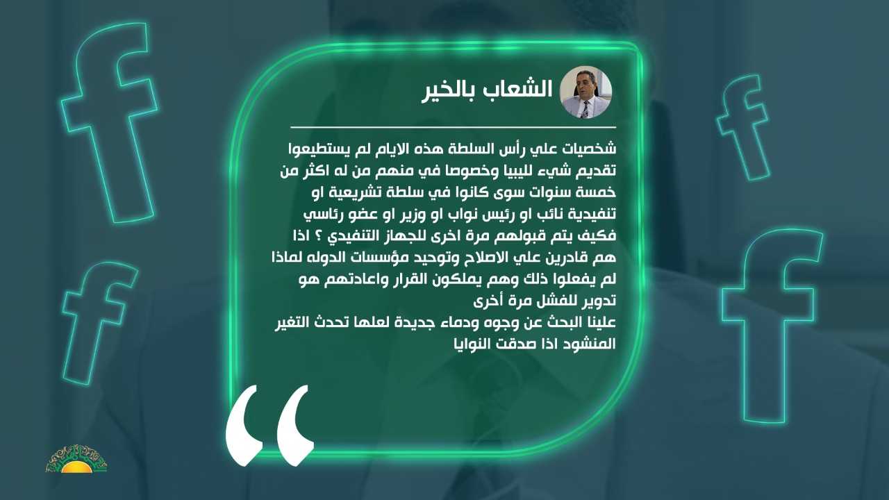 وقال بالخير في تدوينة له على صفحته على فيسبوك: شخصيات على رأس السلطة هذه الأيام لم يستطيعوا تقديم شيء لليبيا وخصوصا في منهم من له أكثر من خمسة سنوات سوى كانوا في سلطة تشريعية أو تنفيذية نائب أو رئيس نواب أو وزير أو عضو رئاسي فكيف يتم قبولهم مرة أخرى للجهاز التنفيذي ؟ إذا هم قادرين على الإصلاح وتوحيد مؤسسات الدولة لماذا لم يفعلوا ذلك وهم يملكون القرار وإعادتهم هو تدوير للفشل مرة أخرى.
